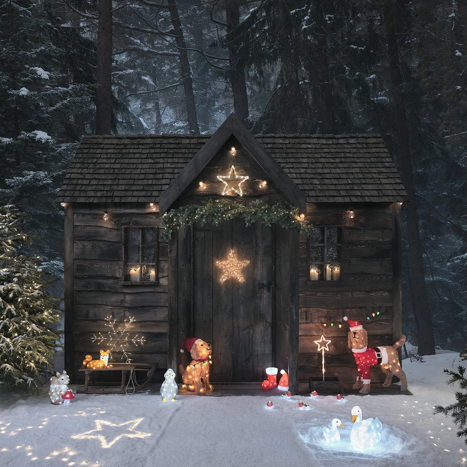 Unsere LED Acryl Eichhörnchen Weihnachtsdekoration wird deinen Garten verzaubern. Diese LED Figur aus wetterfestem Acryl eignet sich hervorragend für alle winterlichen Wetterverhältnisse und kann die gesamte Saison über im Freien bleiben. In deinem Garten oder Vorgarten wird das charmante Eichhörnchen definitiv alle Blicke erregen und sorgt für eine fröhliche Weihnachtsatmosphäre. Es wird von 40 weißen LEDs beleuchtet und verfügt über eine 50 cm lange Zuleitung. Um die Figur zum Leuchten zu bringen, lege einfach 3 AA Batterien in das Batteriefach ein und aktiviere die 6-Stunden-Timerfunktion für eine automatische Beleuchtung jeden Tag zur gleichen Zeit.