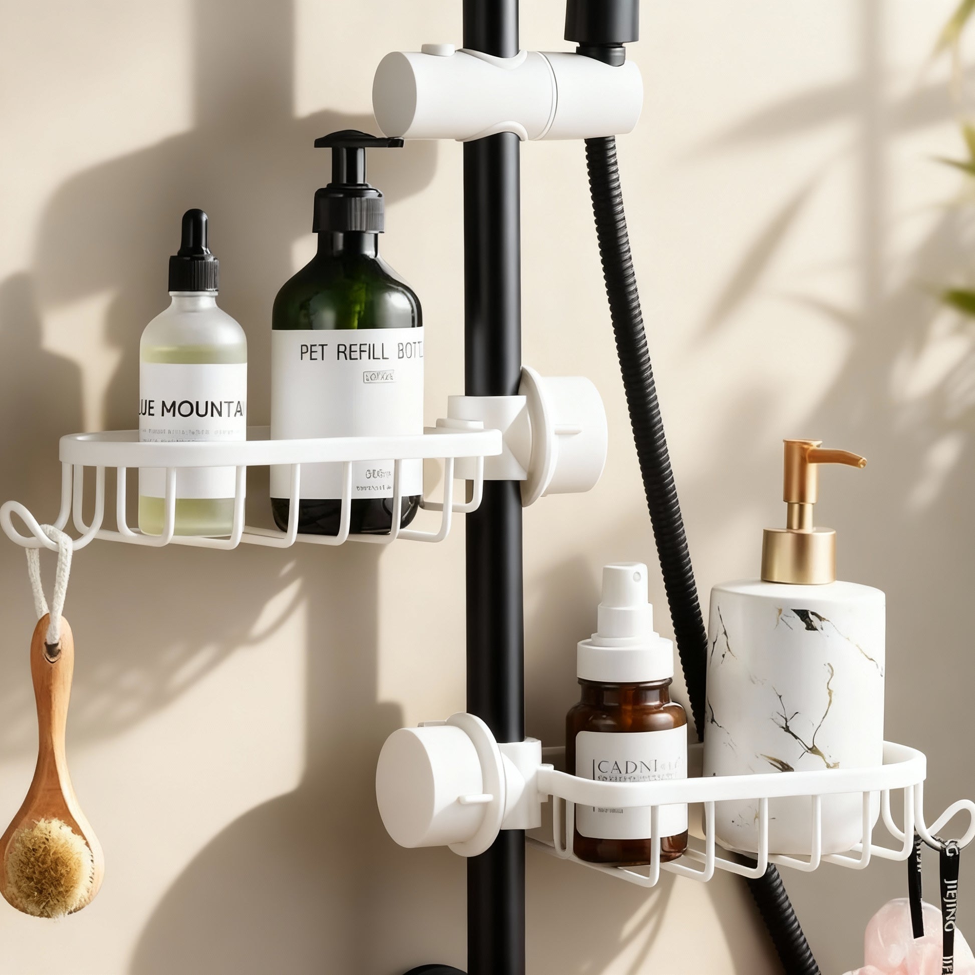Das AquaGrip Duschregal ist die ideale Lösung, um Shampoo, Seife und andere Pflegeprodukte praktisch und ordentlich zu verstauen. Dank seines rostfreien Edelstahl-Designs bleibt alles sauber und trocken, während das offene Gitterdesign Wasseransammlungen verhindert. Einfach am Duschkopf oder an der Stange zu befestigen – ganz ohne Werkzeug.