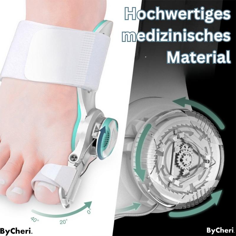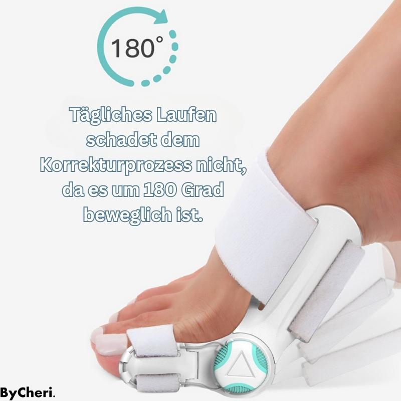 In diesem Abschnitt geht es um die Werte des Knaufdesigns. Im Gegensatz zu typischen Geräten zur Korrektur von Ballenzehen können Sie den Winkel der Zehenkorrektur mithilfe einer Skala frei wählen und einstellen. Dank der flexiblen Drehbarkeit von 180° können Sie die Ballenzehenkorrektur leicht verwenden, ohne dass die Korrekturfunktion beeinträchtigt wird.