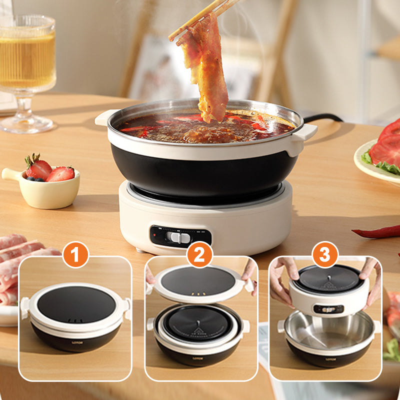 VIELSEITIG UND PRAKTISCH: Perfekt zum Kochen, Dämpfen und Schmoren. Der Topf lässt sich einfach abnehmen und dient gleichzeitig als Utensil. Der Herd unterstützt verschiedene flache Kochgeschirre, was das Wasserkochen und die Zubereitung vielfältiger Gerichte mühelos macht.