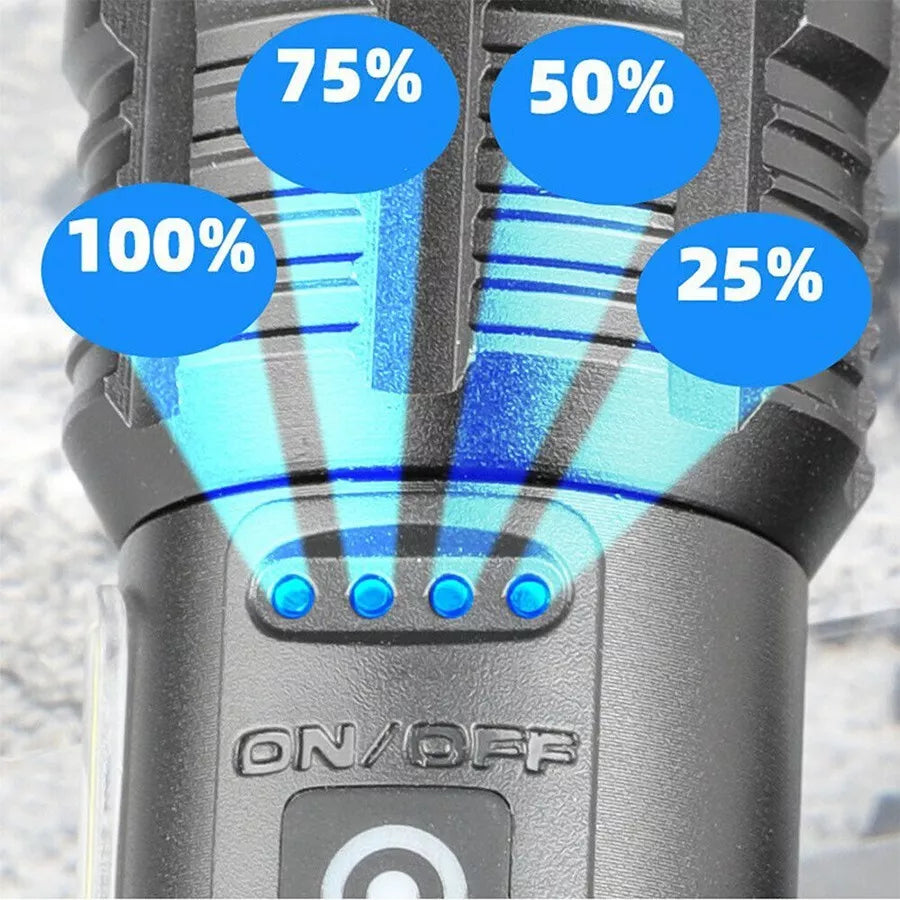 Verwandeln Sie die Dunkelheit in Tag mit der leistungsstärksten taktischen Taschenlampe weltweit, die beeindruckende 100.000 Lumen für eine unerreichte Beleuchtung bereitstellt. Egal ob beim Camping, Wandern, bei Stromausfällen oder in Notlagen, dieses Licht liefert unvergleichliche Sichtbarkeit bis zu 3280 Fuß, was Sicherheit und Vertrauen in jeder Situation gewährleistet.