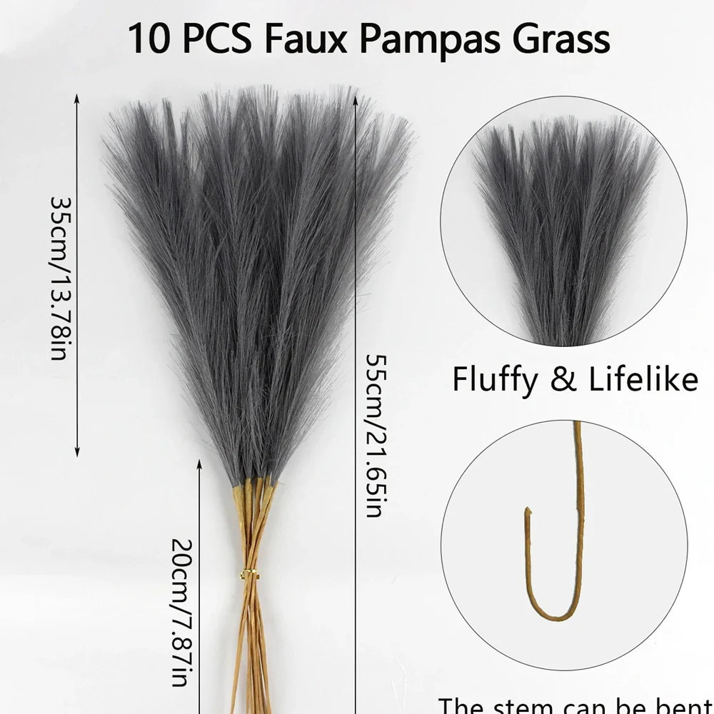 Verleihen Sie Ihrem Zuhause, Ihrer Hochzeit oder Ihrer Partydekoration einen neuen Charakter mit diesem Set von 10 Stück Künstlichen Pampasgrasblumen. Diese naturgetreuen künstlichen Rohrpflanzen sind aus hochwertiger Seide gefertigt und ideal zur Gestaltung beeindruckender DIY-Blumenarrangements. Egal, ob Sie eine Hochzeit, ein Jubiläum oder ein besonderes Event dekorieren, diese künstlichen Pampasgrasstängel bringen einen eleganten und natürlichen Akzent in jeden Raum. Mit ihrer weichen, fluffigen Textur und stilvollen Gestaltung sind sie perfekt für Tischarrangements, Blumensträuße oder als eigenständige Dekorationen für jede Gelegenheit, einschließlich Weihnachten und Einweihungsfeiern.
