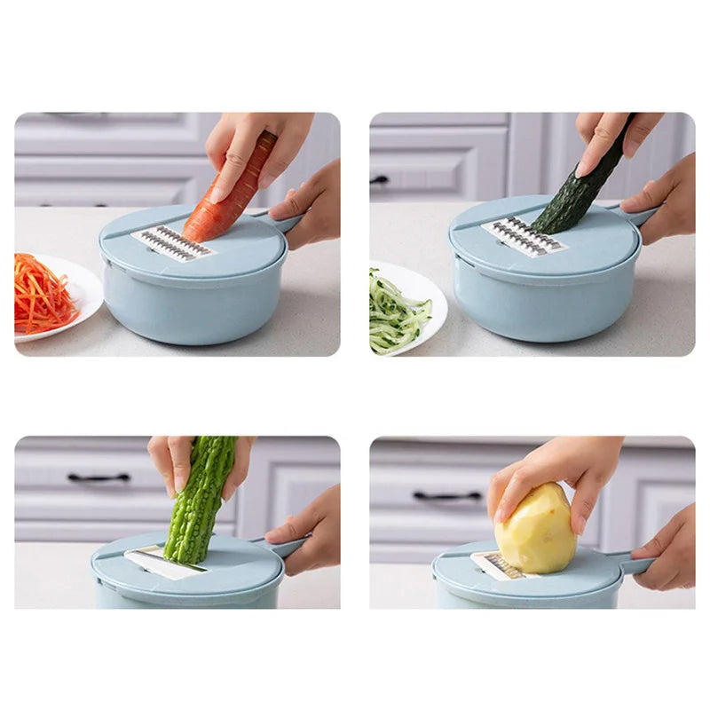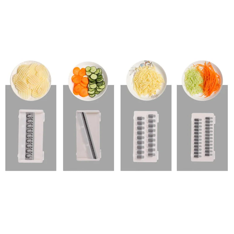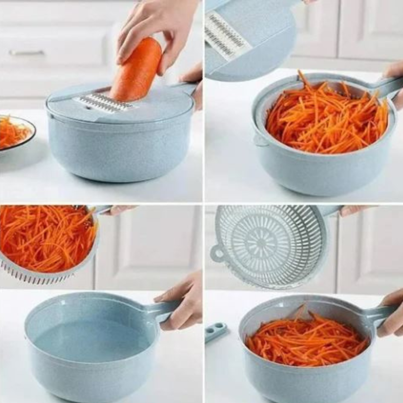 Dieses bahnbrechende Gerät kombiniert 12 essentielle Funktionen in einem kompakten Format, sodass du mühelos hacken, schneiden, würfeln, raspeln, zerkleinern und noch vieles mehr mit Genauigkeit und Leichtigkeit bewältigen kannst. Egal, ob du Salate, Saucen oder Suppen zubereitest – dieser multifunktionale Cutter verbessert deinen Kochablauf und spart dir wertvolle Zeit.