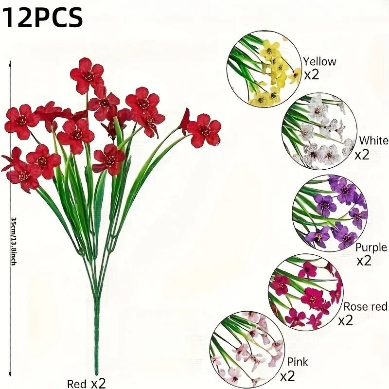 • 12 Stück Kunstblumen für den Außenbereich in verschiedenen Farben (geeignet für unterschiedliche Dekorationsstile)