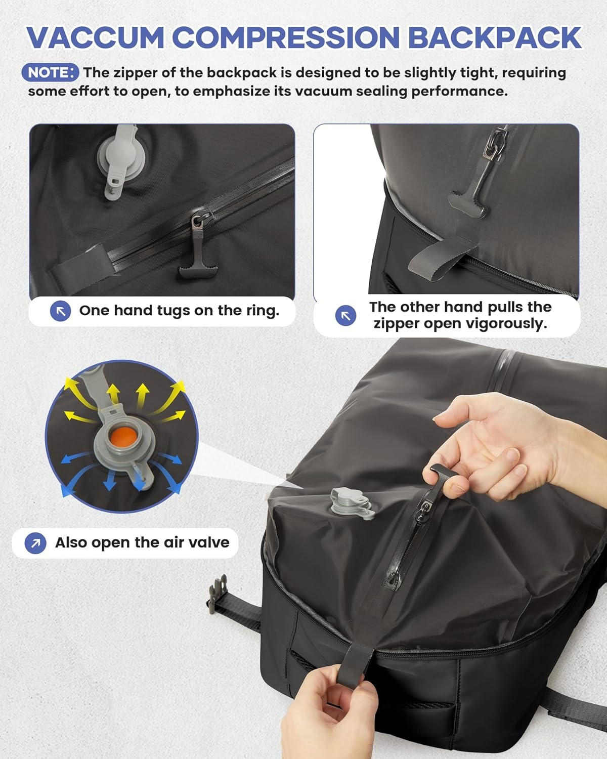 Das ständige Kämpfen mit überfüllten Taschen macht Ihre Reisen frustrierend und unorganisiert. Unser Vakuumkompressions-Rucksack wandelt Ihr chaotisches Packen in ein durchdachtes System um. Genießen Sie die Freiheit, doppelt so viele Kleidungsstücke zu verstauen und gleichzeitig alles sicher und gut erreichbar zu lagern.