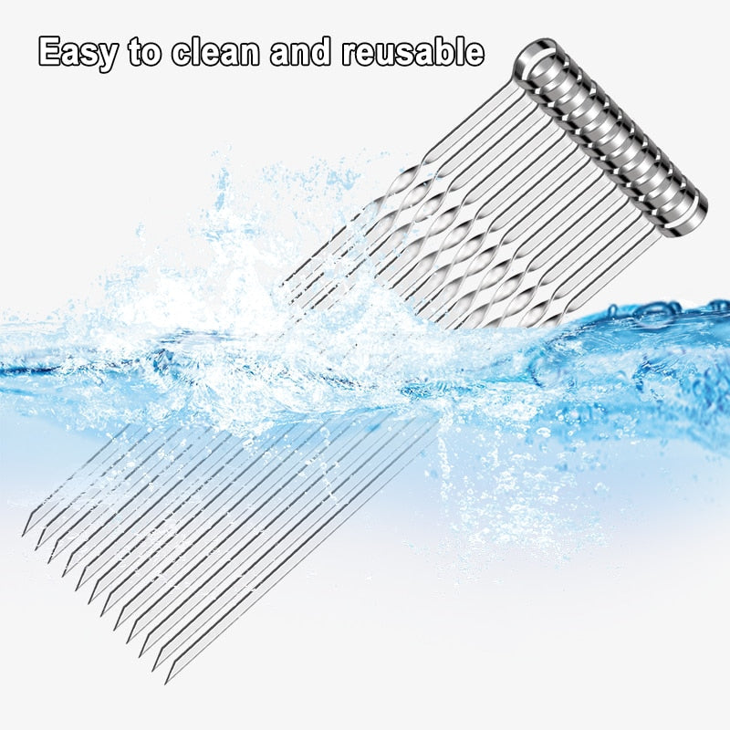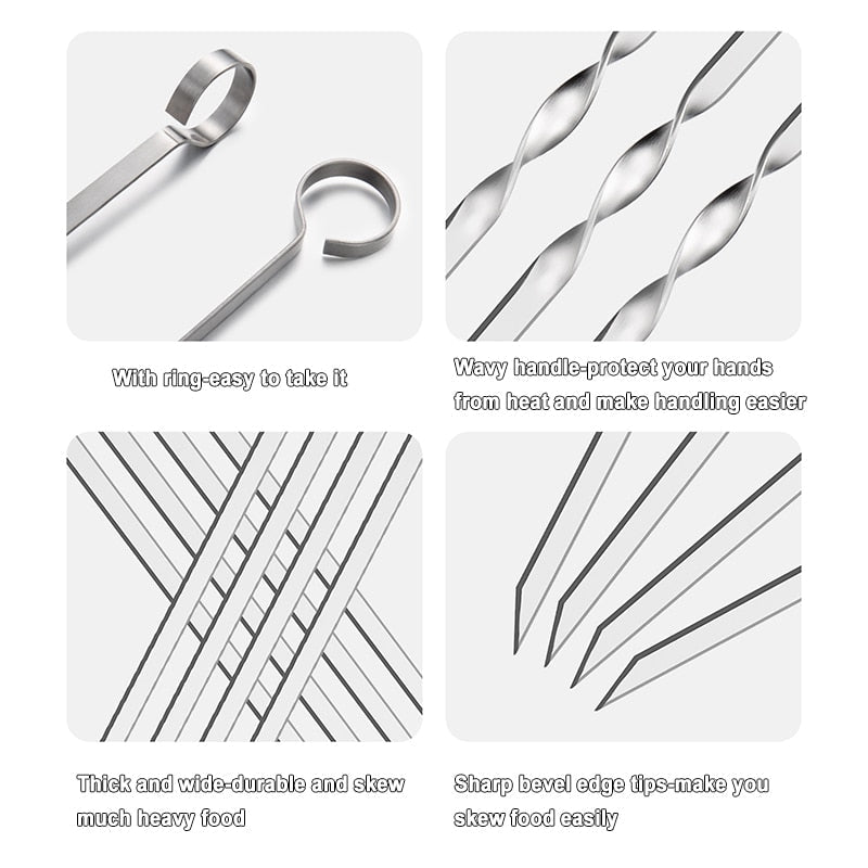 • Mit hitzebeständigen Nylonbürstenköpfen können diese Spieße zum Grillen von Steak, Hähnchen und Gemüse verwendet werden.