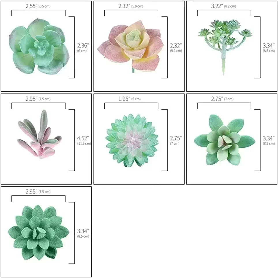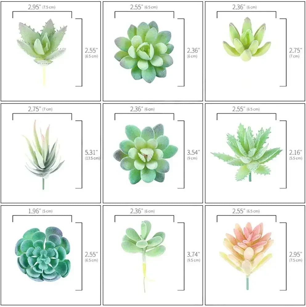 • Vielfalt an Größen und Formen: Das Set umfasst eine breite Palette an Sukkulenten in verschiedenen Größen und Formen (von 2,16 Zoll bis 5,31 Zoll), die Ihnen kreative Flexibilität für Ihre Dekoration bieten.