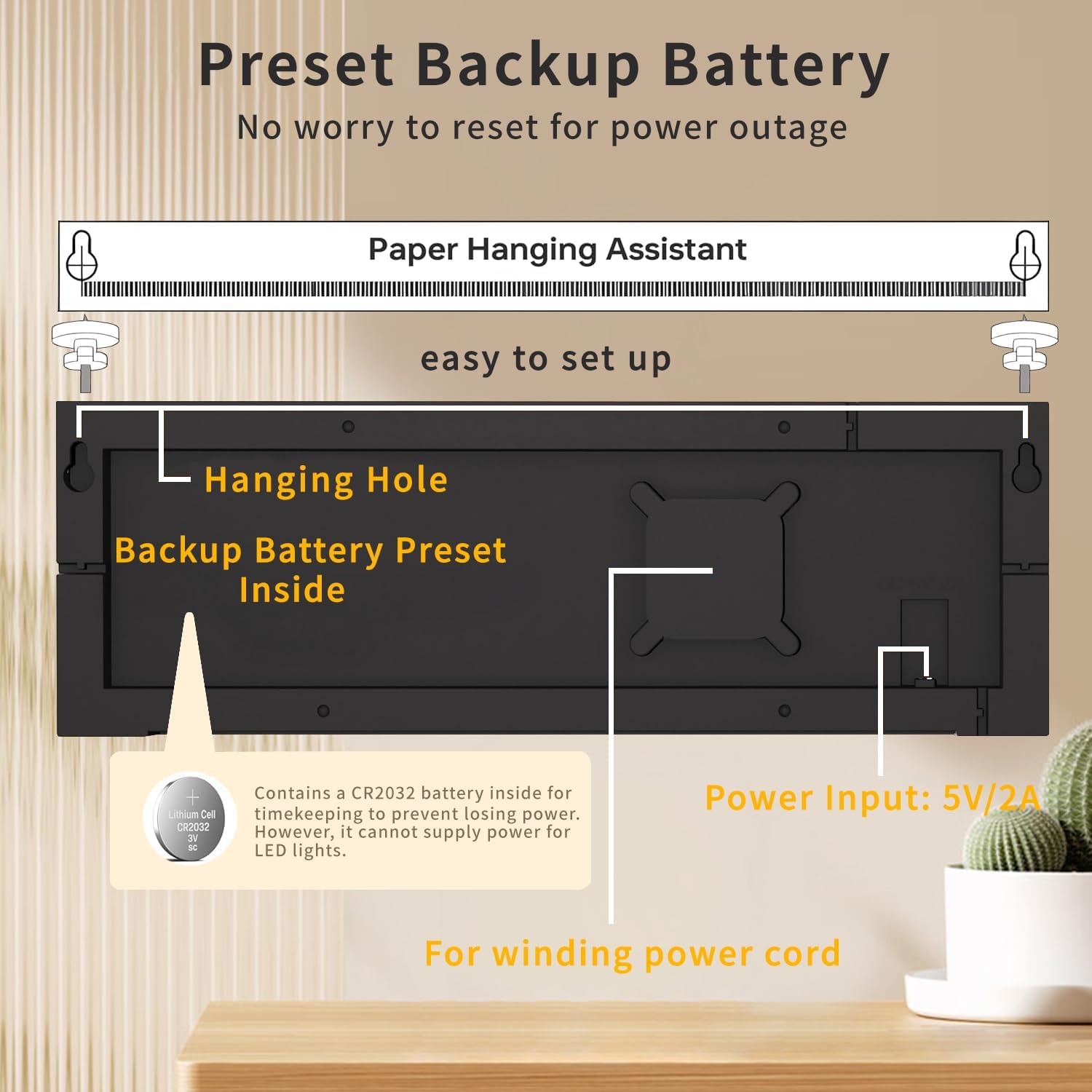 Dieser 16-Zoll digitale Wecker vereint beeindruckende Sichtbarkeit mit moderner Funktionalität. Das 8 RGB-Farbdisplay (4 feste Farben + 4 Farbverläufe) ermöglicht es Ihnen, das Design individuell anzupassen, während die Lesbarkeit aus der Ferne gewährleistet ist. Mit zwei Alarmen und einer Lautstärke von bis zu 115 dB ist er ideal für sowohl leichte als auch schwere Schläfer, auch für ältere Menschen. Die einstellbare Helligkeit, zusammen mit der automatischen Dimmfunktion, sorgt dafür, dass das Display sowohl tagsüber als auch nachts angenehm ist, und das integrierte Nachtlicht bringt eine gemütliche Atmosphäre in Ihren Raum. Zu den weiteren Funktionen gehören ein Countdown-Timer, 12/24 Stunden Zeitformate, Datums- und Temperaturanzeigen sowie eine praktische Fernbedienung für schnelle Einstellungen. Entwickelt, um auf einem Tisch zu stehen oder an der Wand montiert zu werden, wird er über das mitgelieferte 5 V-Netzteil betrieben, um eine konstante Leistung sicherzustellen.