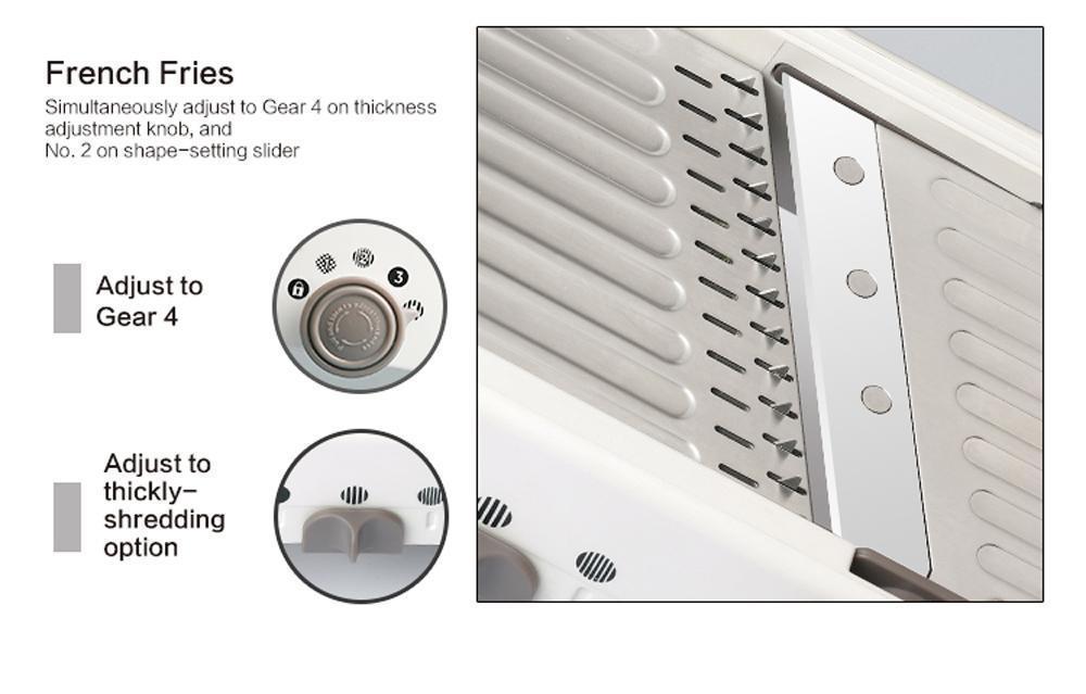 • 18 Schnittgrößen. Schneide und reibe in 18 verschiedenen Dimensionen und Breiten. Gehe ultra-dünn oder mache sie dicker, ganz wie es dir beliebt.