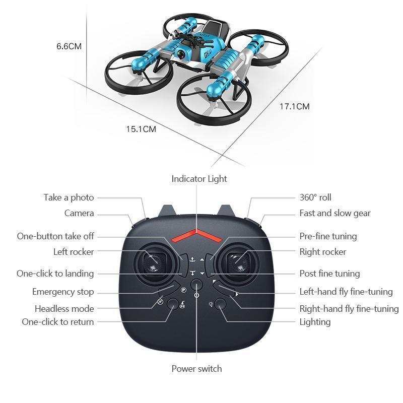 1 x RC-Drohne, 1 x Fernbedienung, 1 x Anleitung, 1 x Schraubendreher, 1 x USB-Kabel, 2 x Propeller, 4 x Räder, 1*Wiederaufladbare Lithium-Batterie