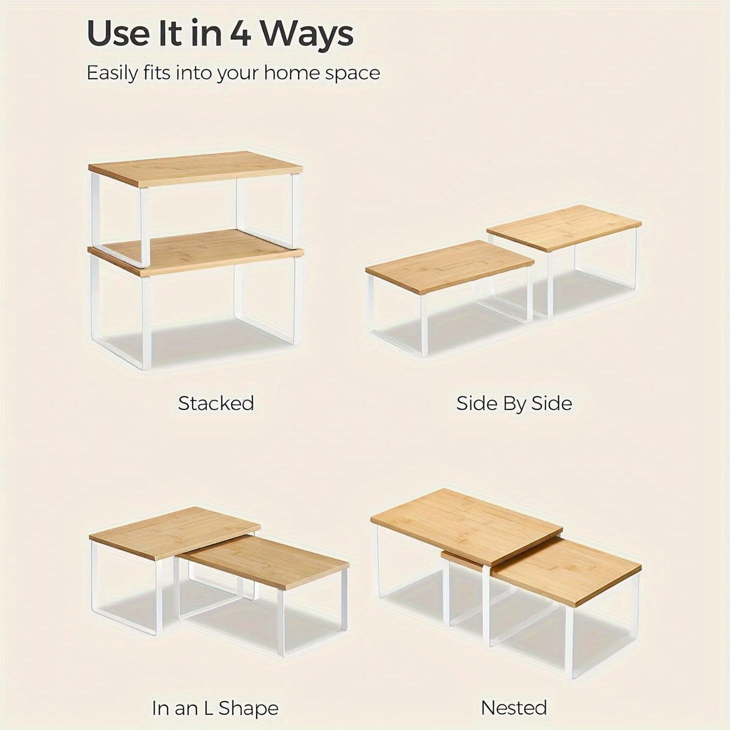 Dieses Set aus zwei Regalen ist perfekt für alle, die mehr Ordnung und Platz in der Küche, im Badezimmer oder im Kleiderschrank schaffen möchten. Die Regale können übereinander gestapelt oder nebeneinander verwendet werden, sodass Sie in jedem Raum flexibel bleiben können. Die Bambusoberfläche verleiht ein warmes Aussehen, während der Metallrahmen Stabilität garantiert. Ideal für Gewürze, Geschirr, Badezimmerprodukte oder sogar Büromaterialien.