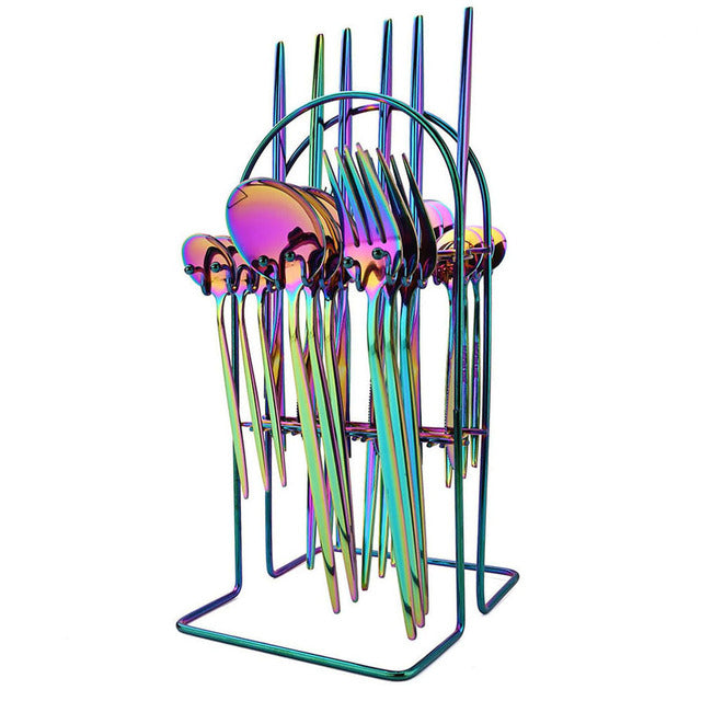 Dieses Küchen-Geschirr ist ideal für den täglichen Gebrauch, besondere Anlässe und Unterhaltung. Dieses 24-teilige Edelstahlbesteck-Set mit bunten Details ist die perfekte Ergänzung für jede Wohnkultur. Spülmaschinenfest. Fertig zur Verwendung direkt aus der Verpackung!