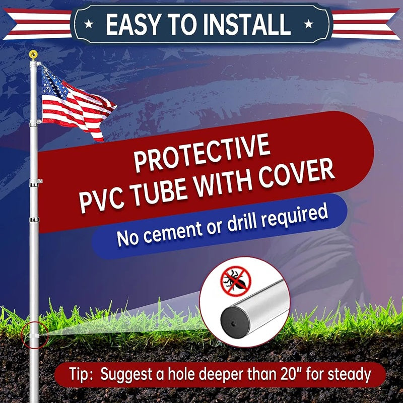 Zeigen Sie mehr als nur ein Zeichen des Stolzes! Dieser Teleskopmast ist so gestaltet, dass er zwei 3ft-Flaggen gleichzeitig hissen kann, dank der zusätzlichen Haltepunkte an den oberen Abschnitten. Ein drehbarer oberer Abschnitt sorgt dafür, dass sich Ihre Flaggen auch bei windigem Wetter nicht um den Mast wickeln – für eine klare und respektvolle Präsentation zu jeder Zeit.