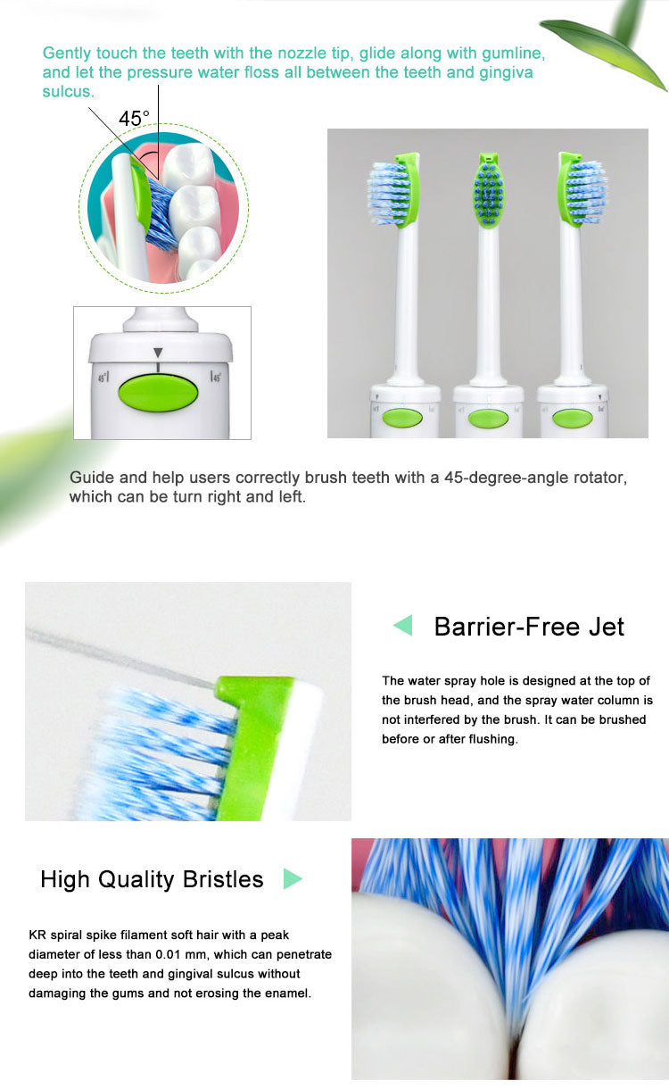 Sowohl der Bürstenkopf als auch die Düse können pulsierendes Wasser mit hohem Druck liefern, können weitgehend Ablagerungen zwischen den Zähnen entfernen und den täglichen Zahnbelag reduzieren. Kombiniert das Zähneputzen mit der Zahnseide. Es ist ideal für den Hausgebrauch und die persönliche Anwendung, um Zähne und Zahnfleisch gesund und attraktiv zu halten.