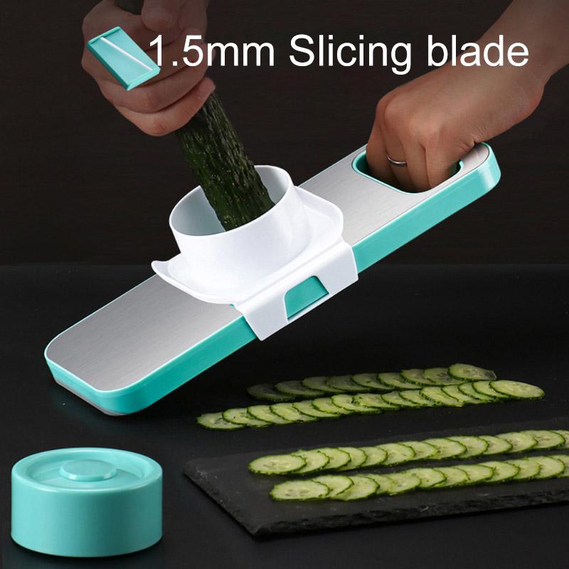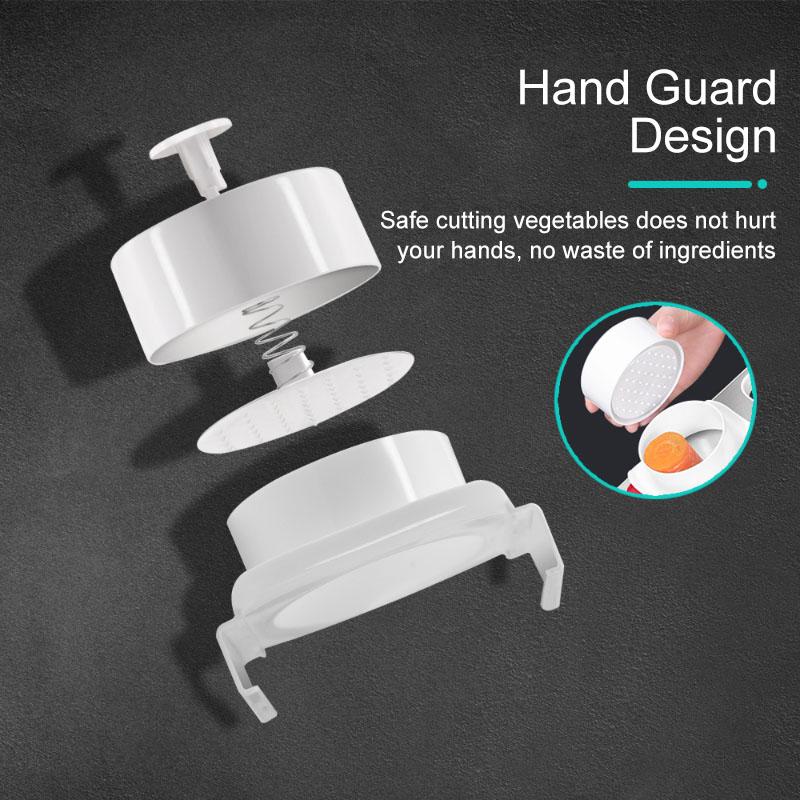 Das komplett geschlossene Design des Federarmschutzes gewährleistet Sicherheit und verhindert, dass Sie in die Hand schneiden, unabhängig davon, ob es sich um eine kleine Zitrone oder eine kleine Kartoffel handelt. Auch kleine Zutaten können mühelos in Scheiben geschnitten werden, ohne dass Rückstände oder Abfälle entstehen.
