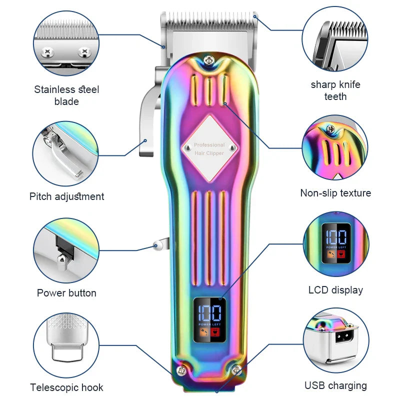 • Der Haarschneider kommt mit verstellbaren Einstellungen und unterschiedlichen Führungszähnen, die anpassbare Haarschnitte, detaillierte Verblendungen und präzises Trimmen ermöglichen.