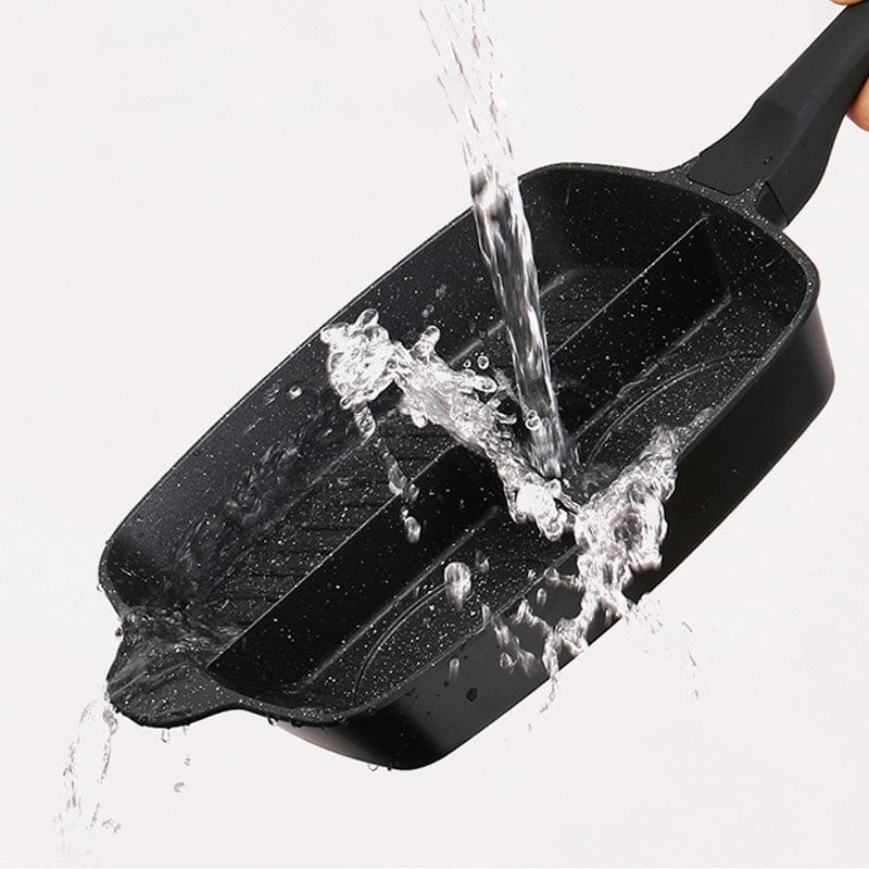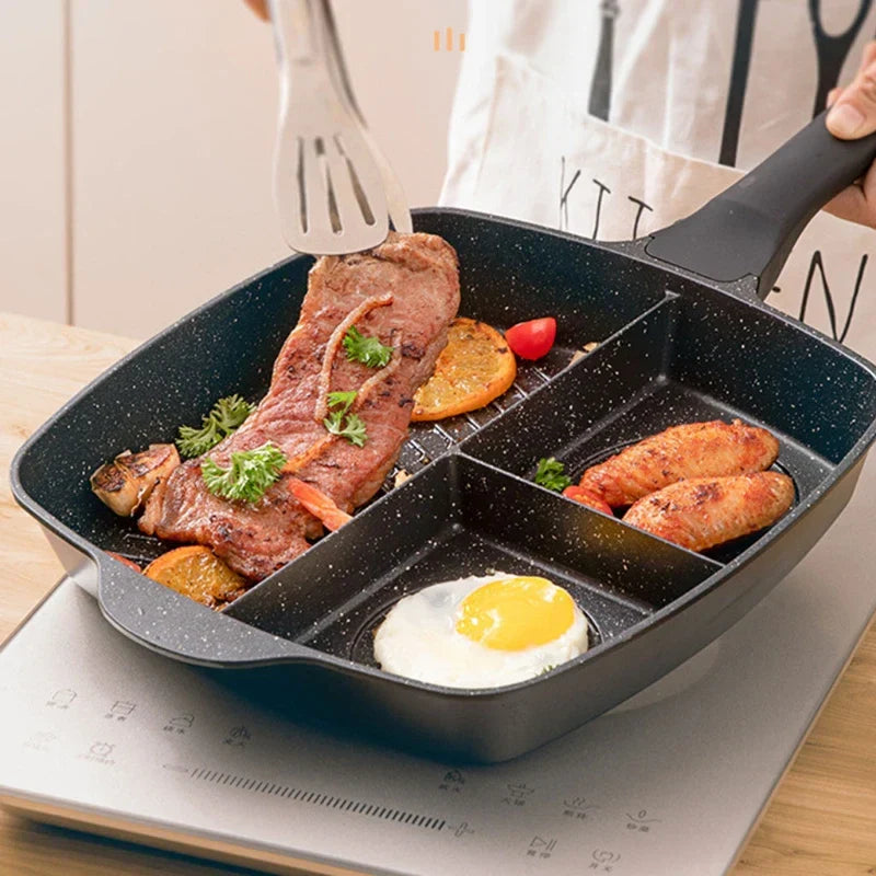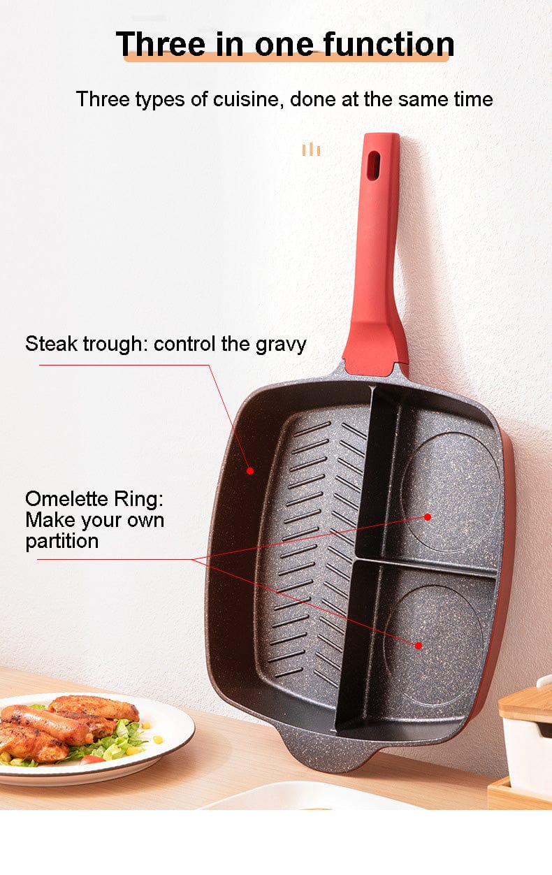 Wir präsentieren Ihnen das perfekte Küchenwerkzeug - die 3-in-1 Antihaft-Pfanne. Hergestellt aus robustem Aluminium und ausgestattet mit einer Antihaft-Oberfläche, ist diese benutzerfreundliche Pfanne ideal, um eine Vielzahl von Lebensmitteln gleichzeitig zuzubereiten, ohne dass etwas festklebt oder schiefgeht. Erfreuen Sie sich an den präzisen Ergebnissen, die Sie sich wünschen, ganz ohne Abstriche.