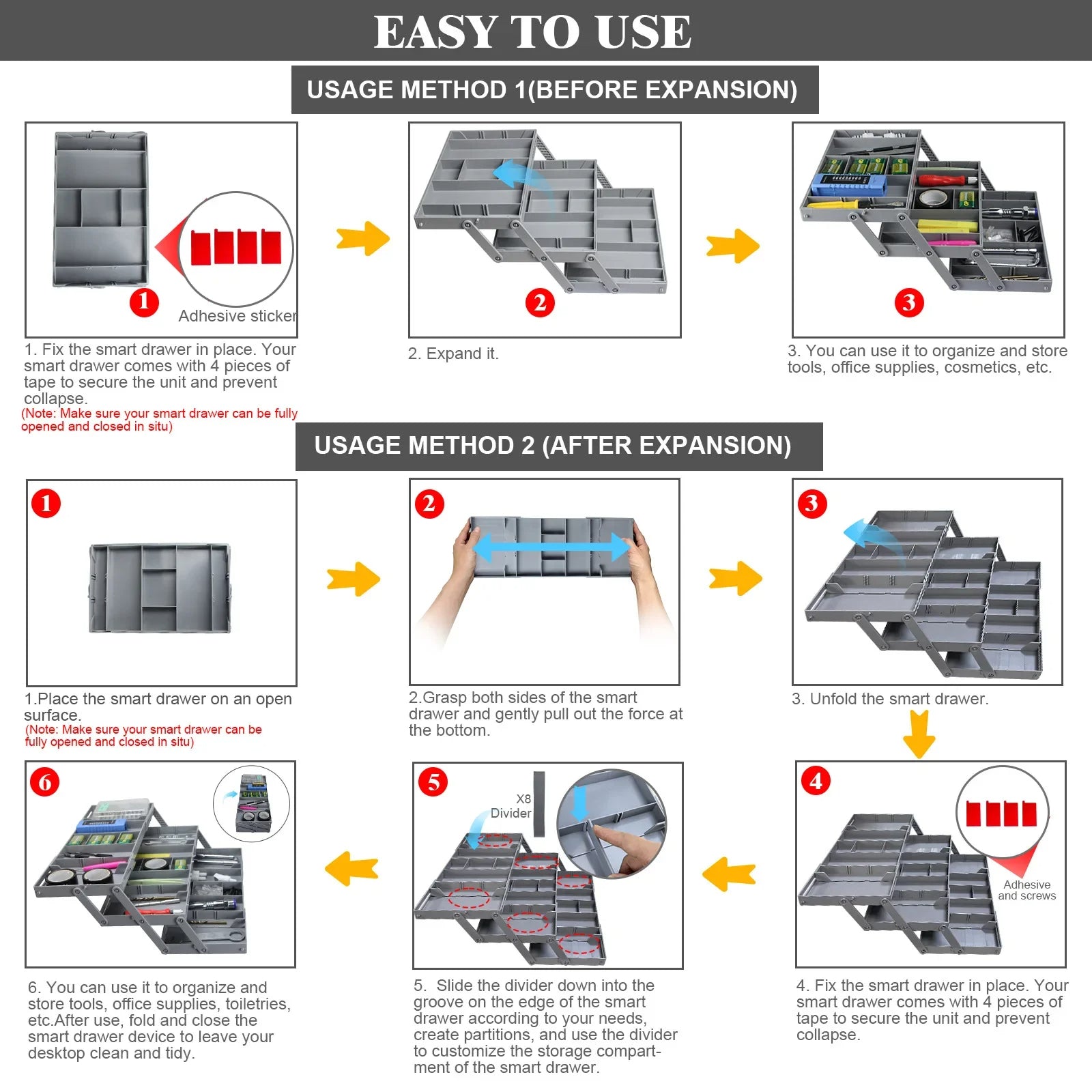 Dieser Schubladenorganisierer für den Schreibtisch besitzt eine robuste Kunststoffkonstruktion mit großer Tragfähigkeit, die Stabilität und eine langfristige Nutzung sicherstellt. Sein mehrschichtiges Design erleichtert die Sortierung und den Zugriff auf verschiedene Artikel, egal ob im Schlafzimmer, Badezimmer, Büro oder Bastelraum. Schluss mit unordentlichen Schubladen – jedes Teil hat jetzt seinen festen Platz.