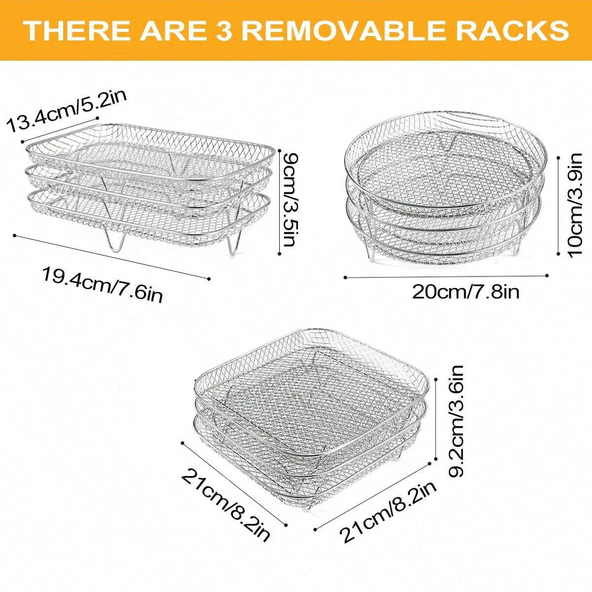 • MEHRERE LEBENSMITTEL EIN MAL BACKEN & GLEICHMÄSSIGES KOCHEN: Drei stapelbare Heißluftfritteusen-Regale können den Kochraum der Heißluftfritteuse erhöhen und ermöglichen es Ihnen, mehrere Lebensmittel gleichzeitig zu kochen, ohne dass sie sich berühren. Das Gitterdesign kann eine bessere Luftzirkulation erzielen, um Lebensmittel knuspriger zu machen und das Kochen gleichmäßiger zu gestalten.