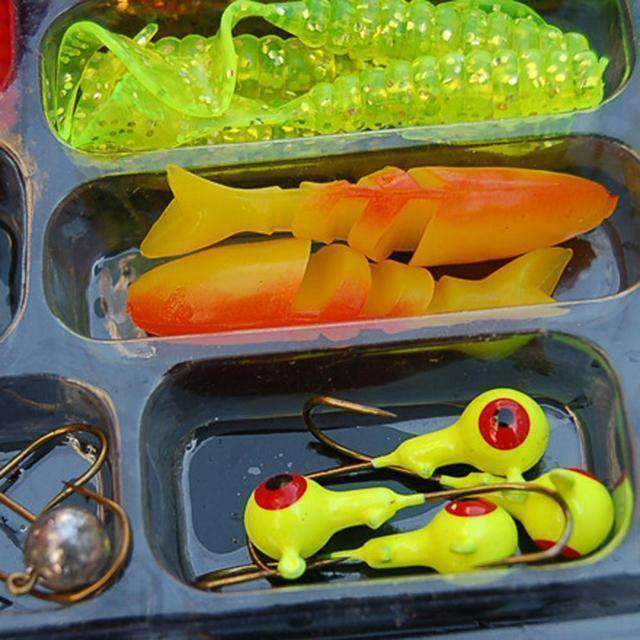 Das Set beinhaltet ungefähr 35 weiche Köder und 10 kleine Jigkopf-Haken.
