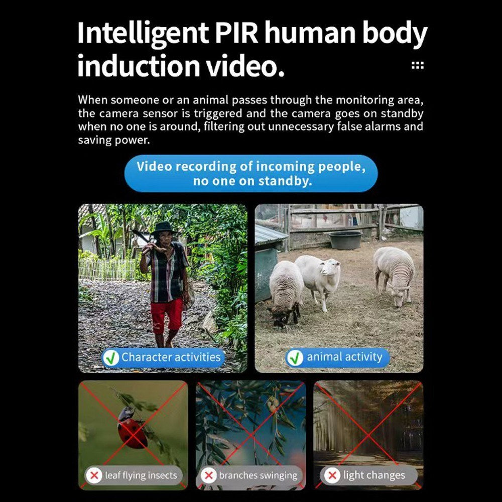 • Intelligente PIR-Bewegungserkennung: Die Kamera erkennt effizient Bewegungen von Menschen oder Tieren und aktiviert den Sensor nur bei Bedarf. Dies hilft, falsche Alarme zu verringern und die Energieeffizienz zu verbessern.