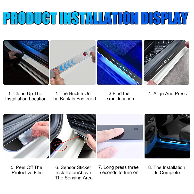 Verbessern Sie Ihr Erlebnis mit unserer verbesserten Lichtinduktionsfunktion. Verwenden Sie einfach das beiliegende Sensorpapier, um die Lichter mühelos zu steuern - an, wenn die Tür geöffnet wird, aus, wenn die Tür geschlossen wird. Genießen Sie den Komfort und Stil der anpassbaren LED-Autotürschwellenlichter.