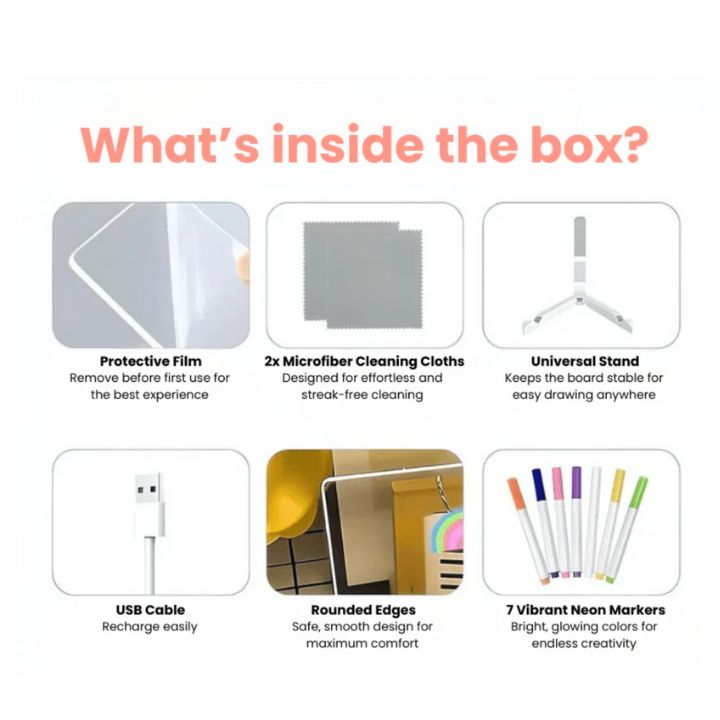 Erwecken Sie die Fantasie Ihres Kindes zum Leben – ganz ohne Tablet oder klebrige Farben. Dieses LED-Acrylbrett bietet eine bunte, leuchtende Möglichkeit zum Malen, Buchstabenlernen oder Spielen. Wiederverwendbar und kinderleicht zu reinigen, fördert es Konzentration, Feinmotorik und Kreativität – ideal für zu Hause, unterwegs oder in der Schule. Perfekt für stundenlangen, bildschirmfreien Spaß!