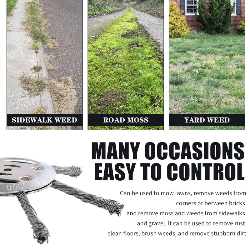 🏠Verwendungsmöglichkeiten Der Stahlseil-Trimmerkopf eignet sich hervorragend für die Rasenpflege. Besonders effektiv beim Entfernen von Unkraut an Ecken oder zwischen Ziegelsteinen, zum Entfernen von Moos auf Gehwegen und zum Bekämpfen von Unkraut auf Sand und Kies. Ideal für die Reinigung von Böden, das Entfernen von Rost und Moos sowie für Gärten, Wege, Höhlen, Parkplätze usw.