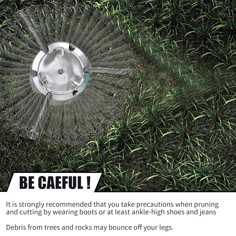✅Zuverlässige Marke Der Draht-Unkrautklingenkopf wurde hinsichtlich Leistung, Sicherheit sowie Qualität geprüft. Denken Sie daran, bei der Verwendung des Stahlseil-Unkrauttrimmerkopfes geeignete Schutzausrüstung zu tragen. Tragen Sie entsprechende Schutzkleidung und eine Schutzbrille.