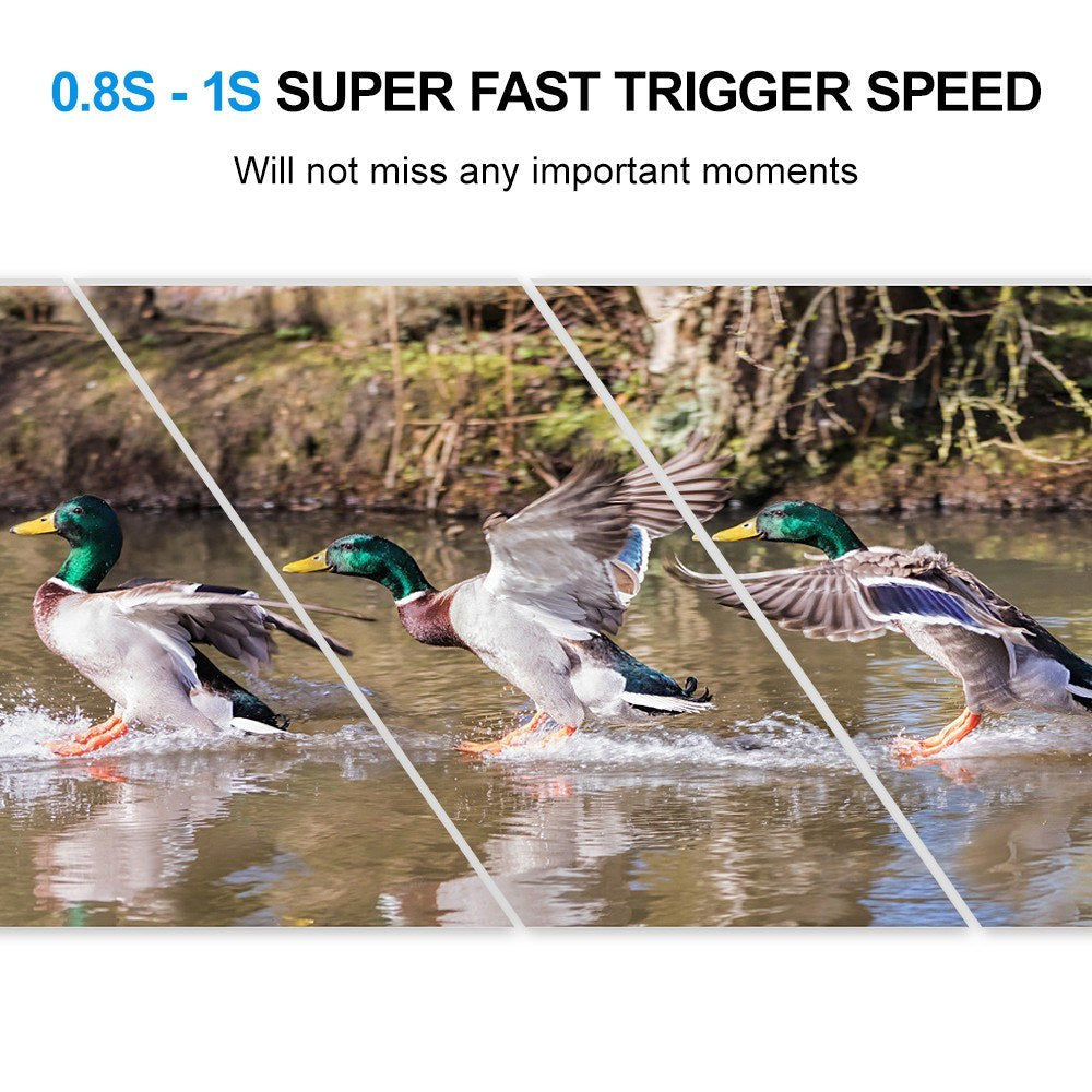 • Schnelle Auslösegeschwindigkeit von 0,8-1,0 Sekunden, die 3 Fotos und Videoclips von 10 Sekunden pro Auslösung aufzeichnen kann.
