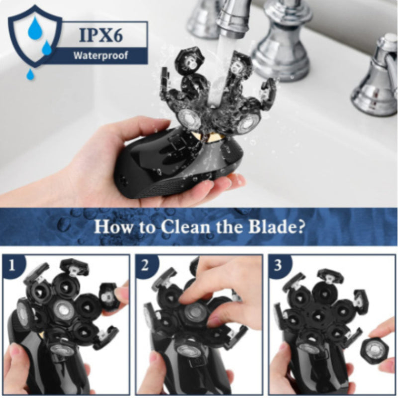IPX6 Wasserdicht: Der elektrische Rasierer für Herren verfügt über eine wasserdichte IPX6-Funktion, die das Rasieren sowohl mit als auch ohne Bartbalsam für trockenes oder nasses Rasieren ermöglicht. Sie können den Rasierer direkt unter fließendem Wasser reinigen. (Hinweis: Bitte heben Sie jede Klinge an, um die Haare zu entfernen)