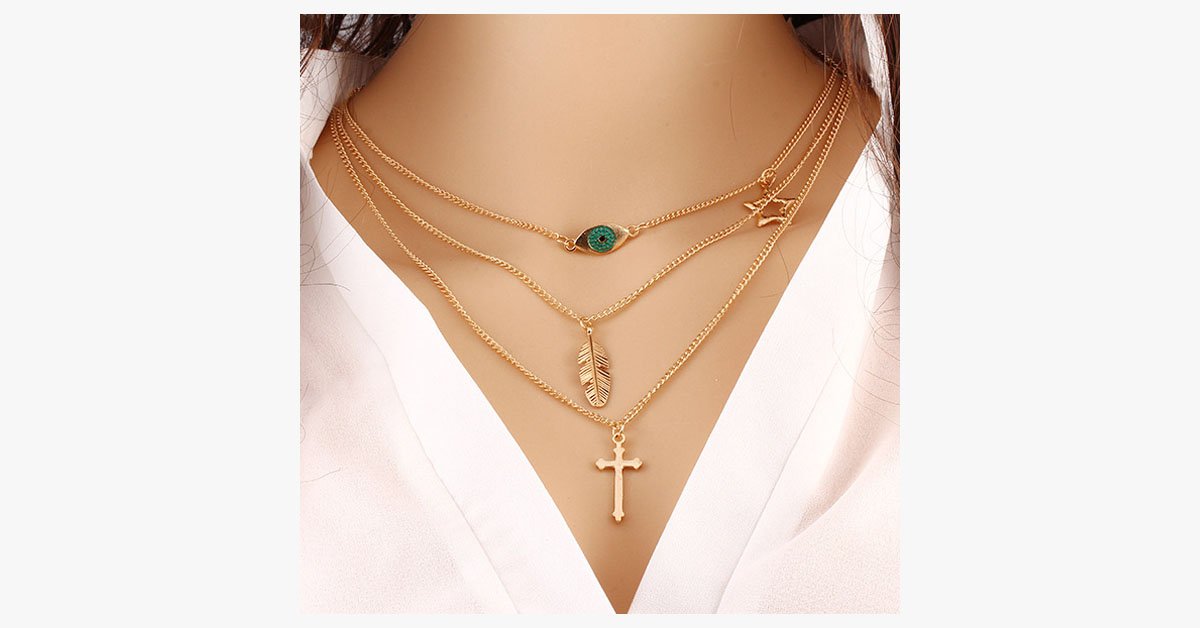 Diese schichtweise Ketten-Halskette ist das ideale Schmuckstück, um jedem legeren Outfit einen Hauch von Eleganz und Charakter zu verleihen. Sie wird mit einem kleinen Kreuz-Anhänger, einem bösen Blick-Anhänger und einem feinen Charm in Form eines Sterns und eines Blattes geschmückt. Ein wunderbares Geschenk, das jede Dame zu schätzen wüsste.