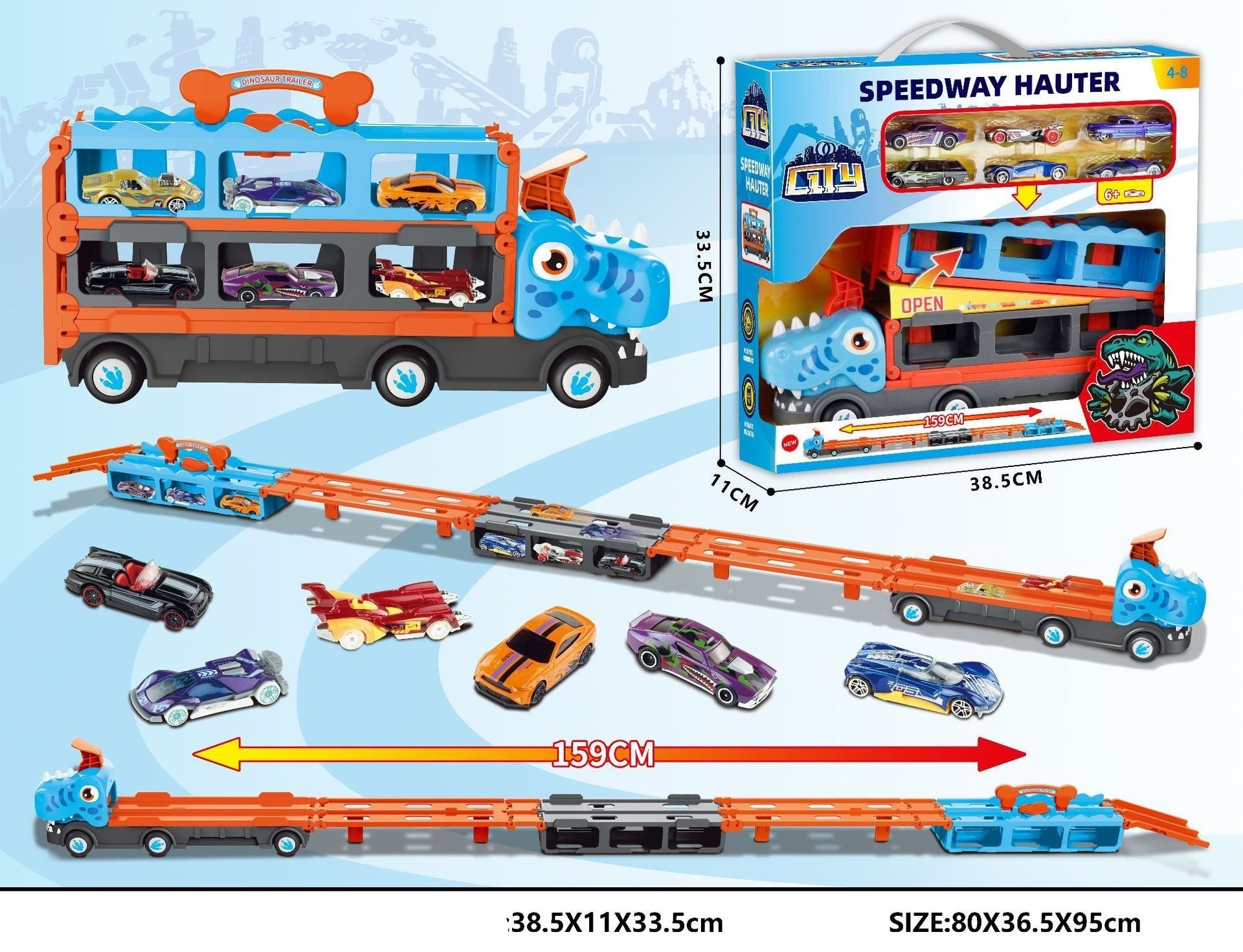 Erlebe aufregende Abenteuer auf vier Rädern mit dem klappbaren Dino Rennwagen! Dieser außergewöhnliche Transporter im Dinosaurier-Look bringt deine liebsten Rennautos sicher und stilvoll an jedes Ziel. Einfach aufklappen, Autos verstauen und das Race kann starten – ein Spielzeug, das Kinder stundenlang unterhält und begeistert!
