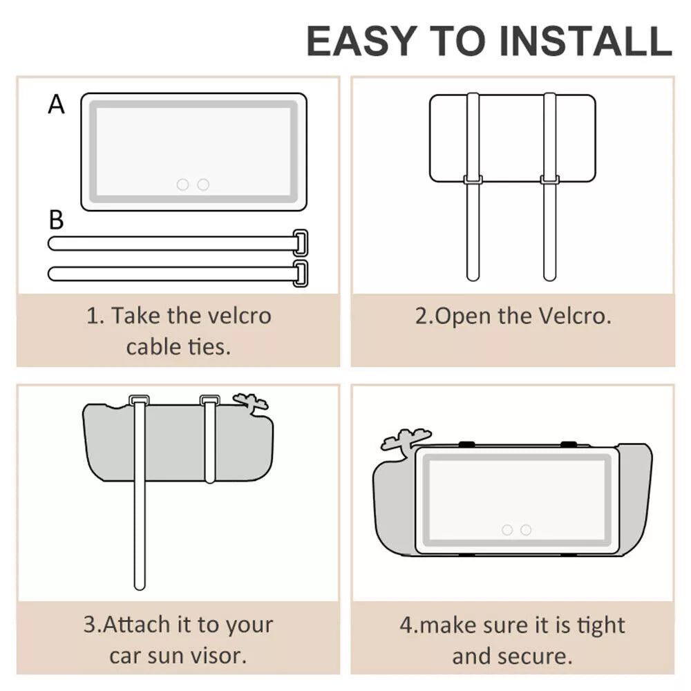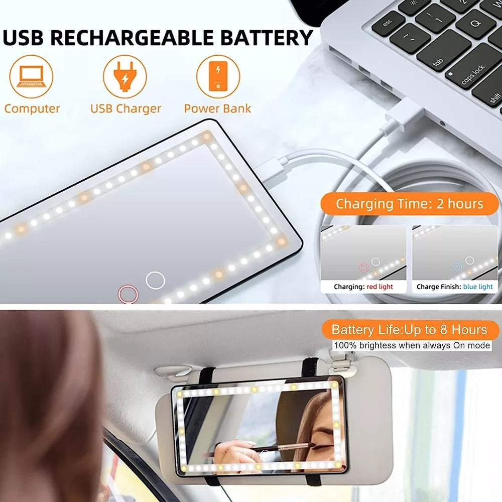 Bringen Sie den Spiegel mühelos mit der sicheren Clip-on-Halterung an Ihrer Sonnenblende an. Schalten Sie ihn über die berührungsempfindlichen Bedienelemente ein, und passen Sie die Helligkeit sowie den Lichtmodus nach Ihren Bedürfnissen an. Laden Sie ihn über USB auf, indem Sie ihn an Ihr Auto, eine Powerbank oder einen Laptop anschließen, um eine unterbrechungsfreie Nutzung zu gewährleisten.