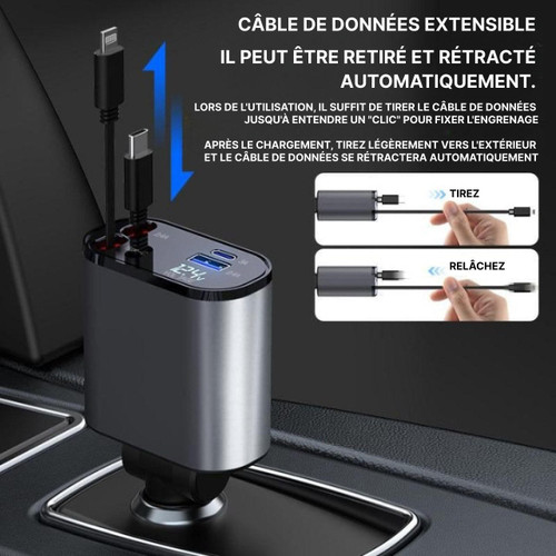 Dieses elegante Gerät ermöglicht es Ihnen, Ihre Geräte schnell aufzuladen, während Sie fahren, und optimiert so Ihre Zeit und Ihren Komfort.