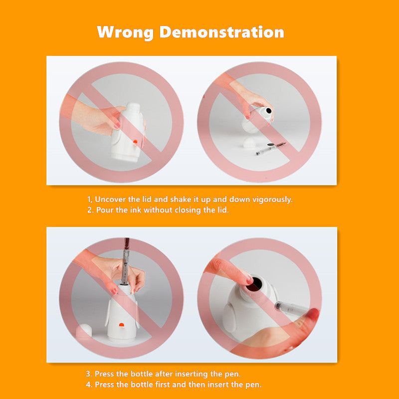 • EINFACH zu benutzen: Es sind nur drei Schritte erforderlich. Öffnen Sie den Deckel der Tintenflasche, stecken Sie die Feder in die Öffnung der Flasche, üben Sie leichten Druck aus und warten Sie 10 Sekunden , bis die Tinte bereit ist.