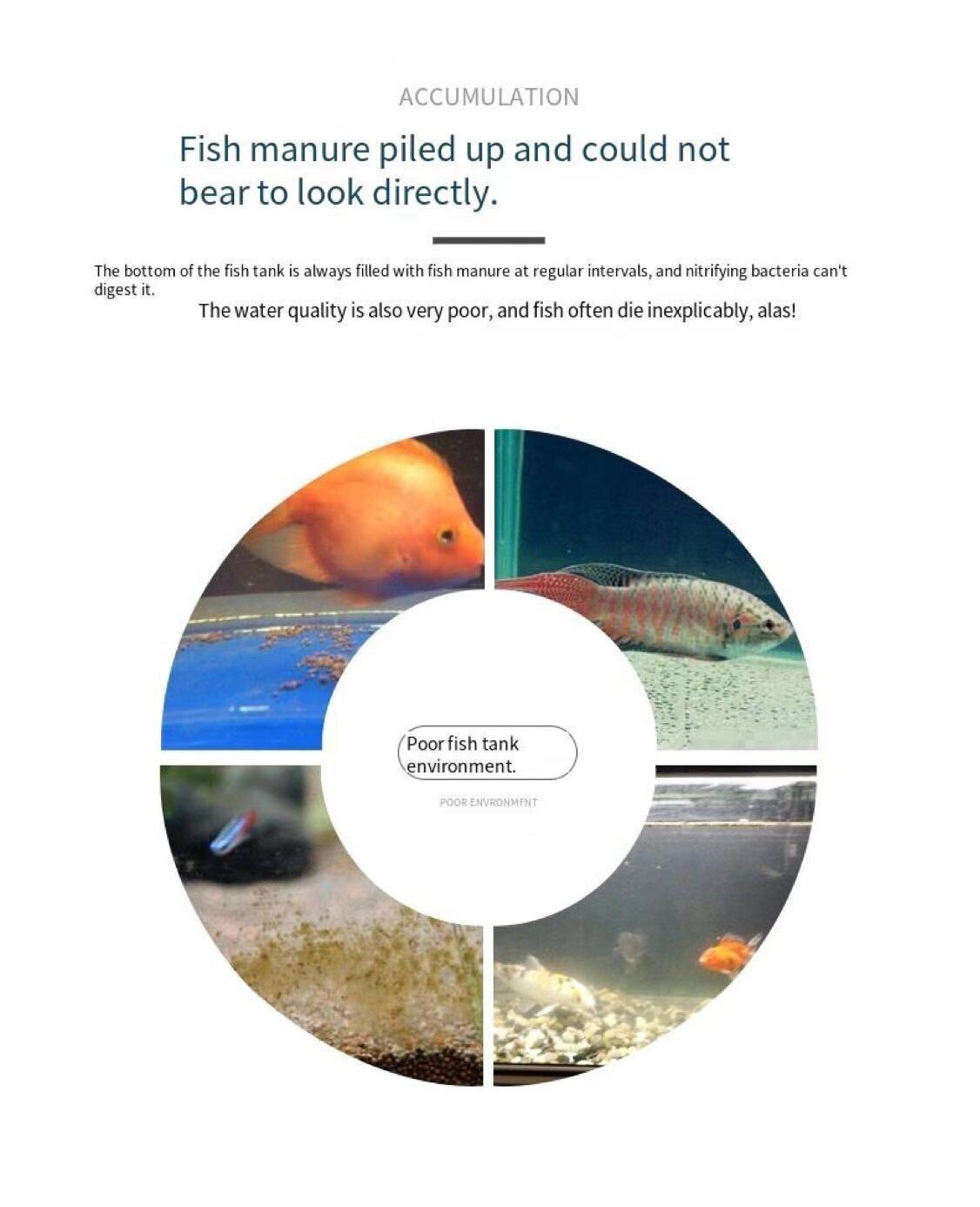 • Stellen Sie das Gerät einfach in den Aquariumtank und schließen Sie es an eine Luftpumpe an. Wenn das Fach voll mit Fischabfall ist, leeren und desinfizieren Sie es, bis es sauber ist, bevor Sie es wieder in den Aquariumtank zurücklegen.