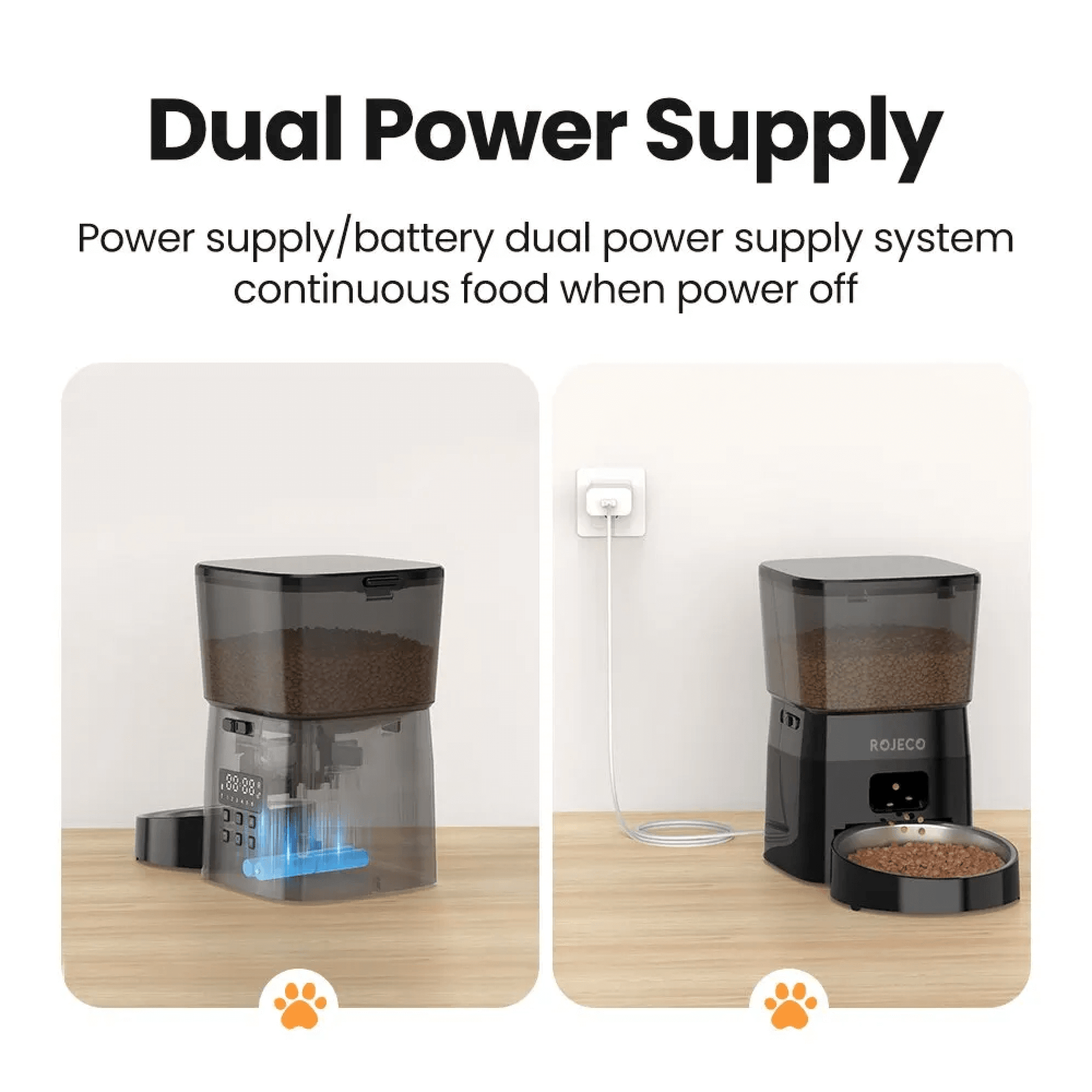 Dieser automatische Futterspender wird von zwei Energiequellen gespeist: einem klassischen Netzadapter und einer Backup-Batterieversorgung. Das bedeutet, dass der Fütterungszeitplan Ihres Haustiers auch bei einem Stromausfall nicht unterbrochen wird. Die Batterie-Backup-Funktion gewährleistet, dass Ihr Haustier seine Mahlzeiten wie geplant erhält – ein wesentliches Merkmal für Zuverlässigkeit und Ihr Seelenfrieden.