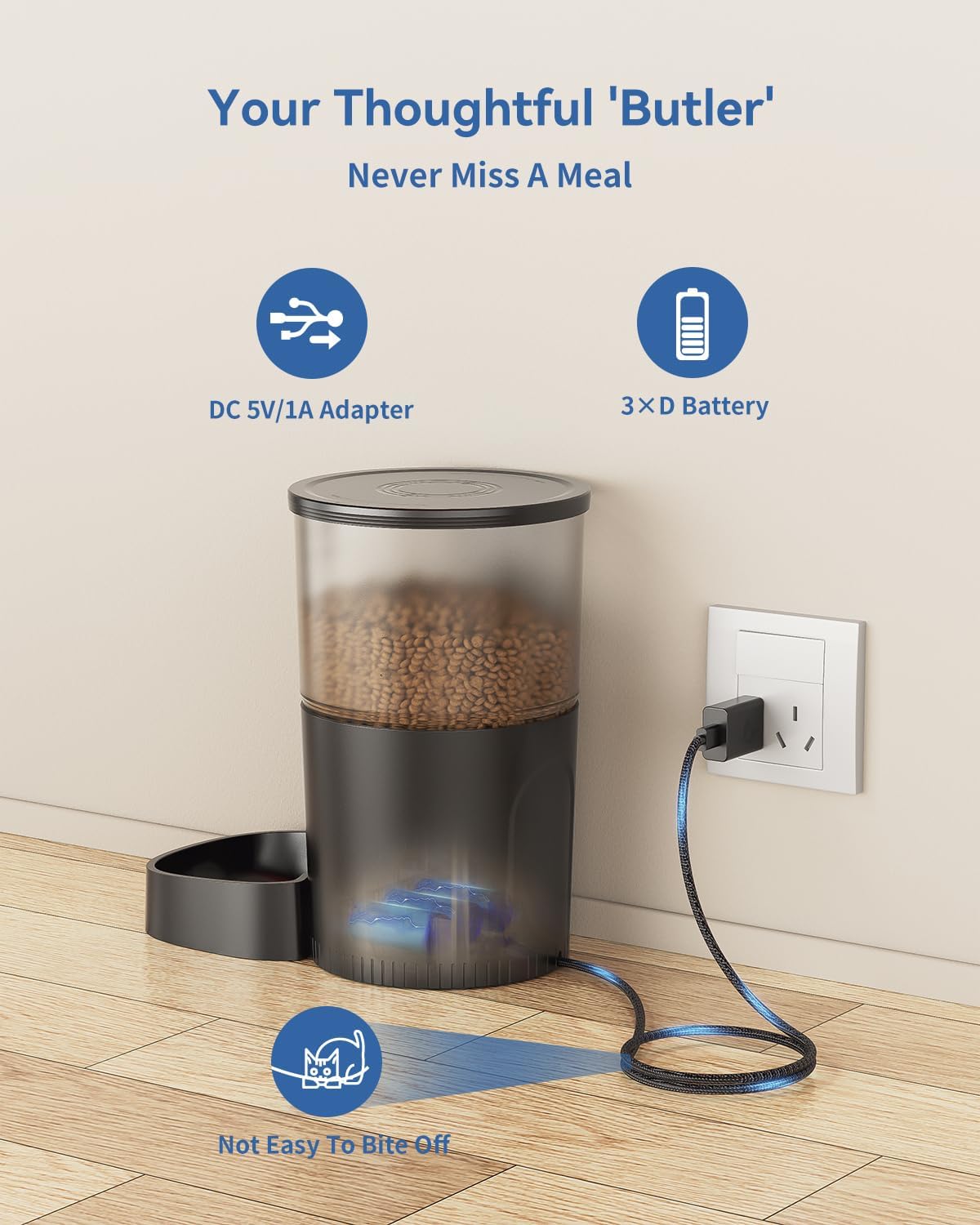 DOPPELTE ENERGIEQUELLE: Keine Sorgen mehr bei Stromausfällen! Unser automatischer Futterspender kann über ein 5V DC-Netzteil oder 3 Alkaline D-Batterien (nicht enthalten) betrieben werden. Wir nutzen das neueste Stromversorgungssystem, um eine konstante Futterzufuhr für Ihre geliebten Haustiere sicherzustellen.
