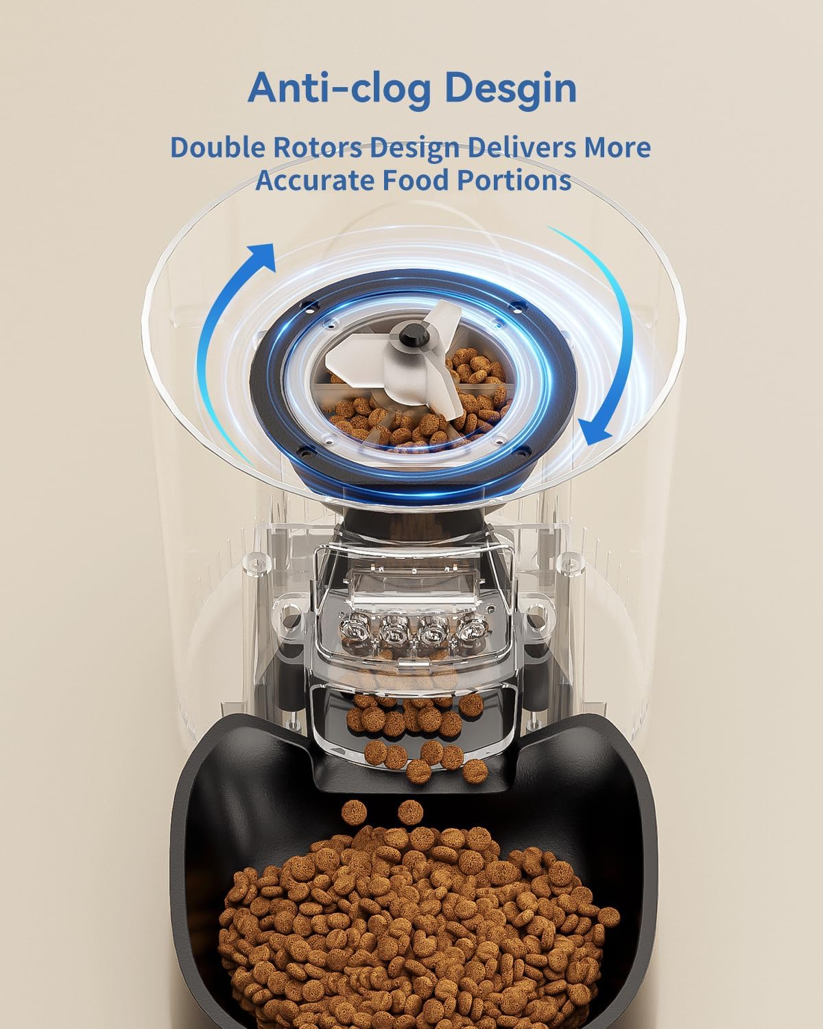 Dieser smarte Futterspender erlaubt es Ihnen, die Portionsgrößen und Fütterungszeiten individuell auf die Bedürfnisse Ihrer Katze einzustellen. Programmieren Sie bis zu 36 Mahlzeiten am Tag, mit maximal 9 Portionen pro Mahlzeit. Das Anti-Verstopfungs-Design sorgt dafür, dass es zu keinen Futterstaus kommt, sodass die Mahlzeiten reibungslos bereitgestellt werden.