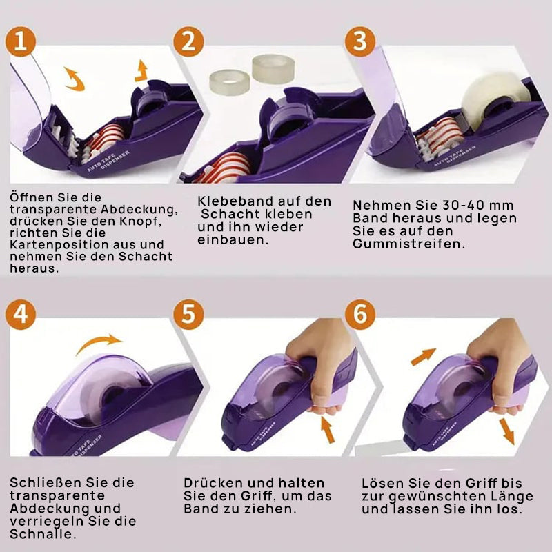 • Automatisches Abrollen: Wenn Sie den Hebel nach unten drücken, gibt der Abroller automatisch 1" Klebeband aus, sodass Sie zügig und mühelos die gewünschte Länge erhalten, ohne das Band manuell abreißen oder schneiden zu müssen.