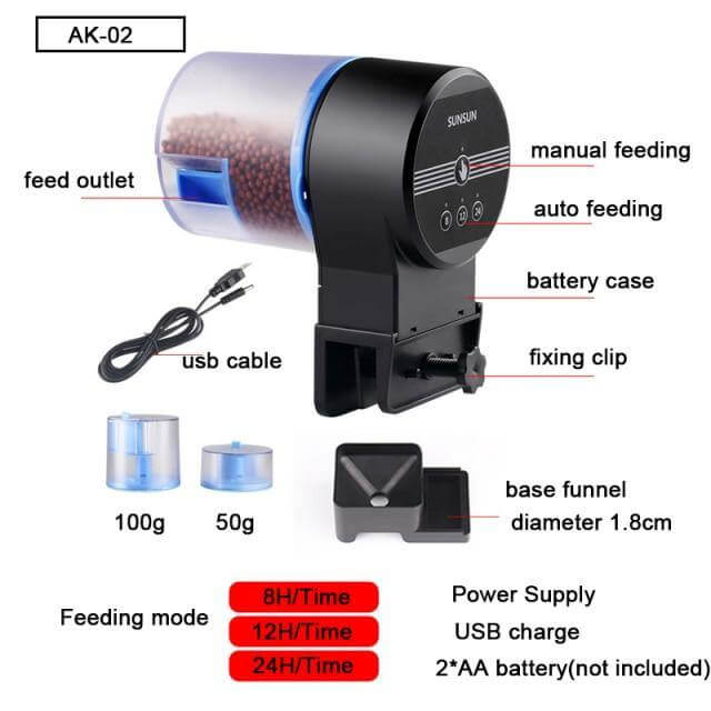 • Feuchtigkeitsbeständiger Trichter hält das Futter frisch und ermöglicht die Verwendung der meisten Futtertypen, einschließlich Flocken, Pellets oder Krümel.