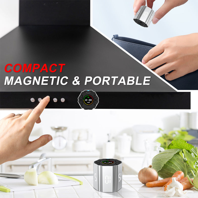 • Compact, magnetic and rechargeable. The timer has a magnetic base that can be attached to the fridge or any other metal surface, allowing you to keep your hands free while measuring the time.