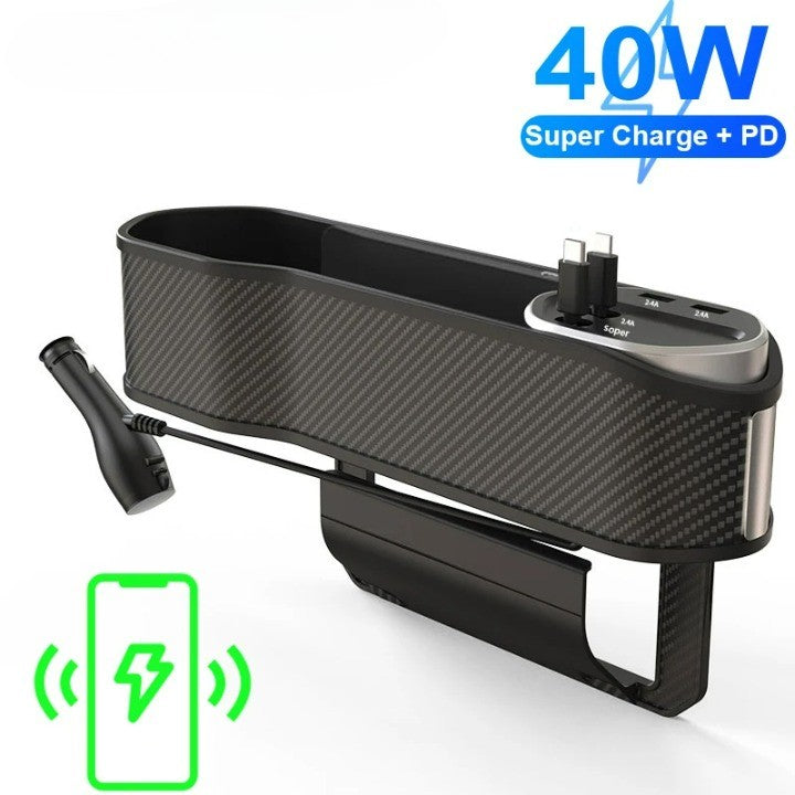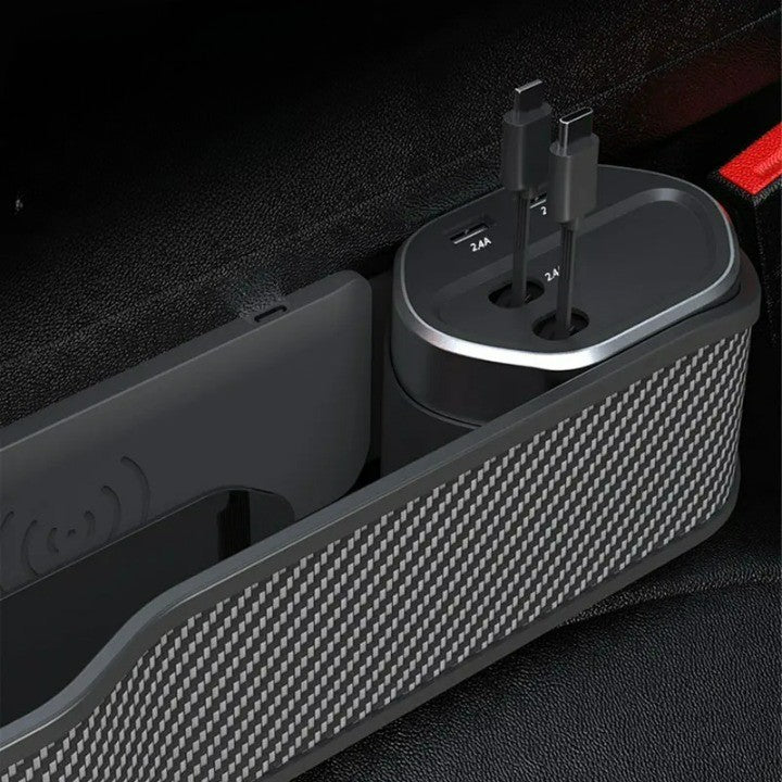 1x Organizer für die Lücke zwischen den Autositzen mit Getränkehalter und kabellosem Ladegerät