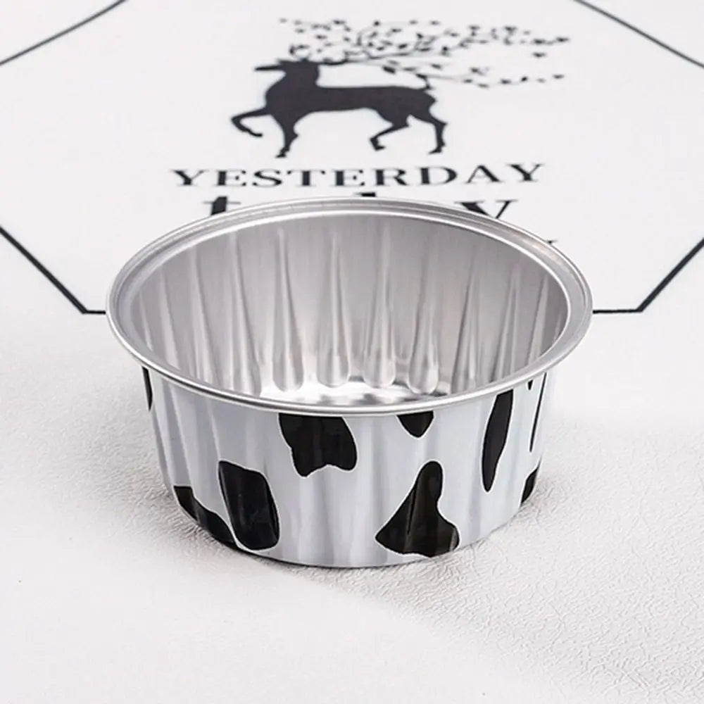 Material: Aluminiumfolie (lebensmittelecht) Durchmesser oben/unten: 8,3 cm / 6,4 cm Höhe: 3,6 cm Gewicht: 3,2 g Farben: Gold, Hellblau, Kuhmuster Form: Rund