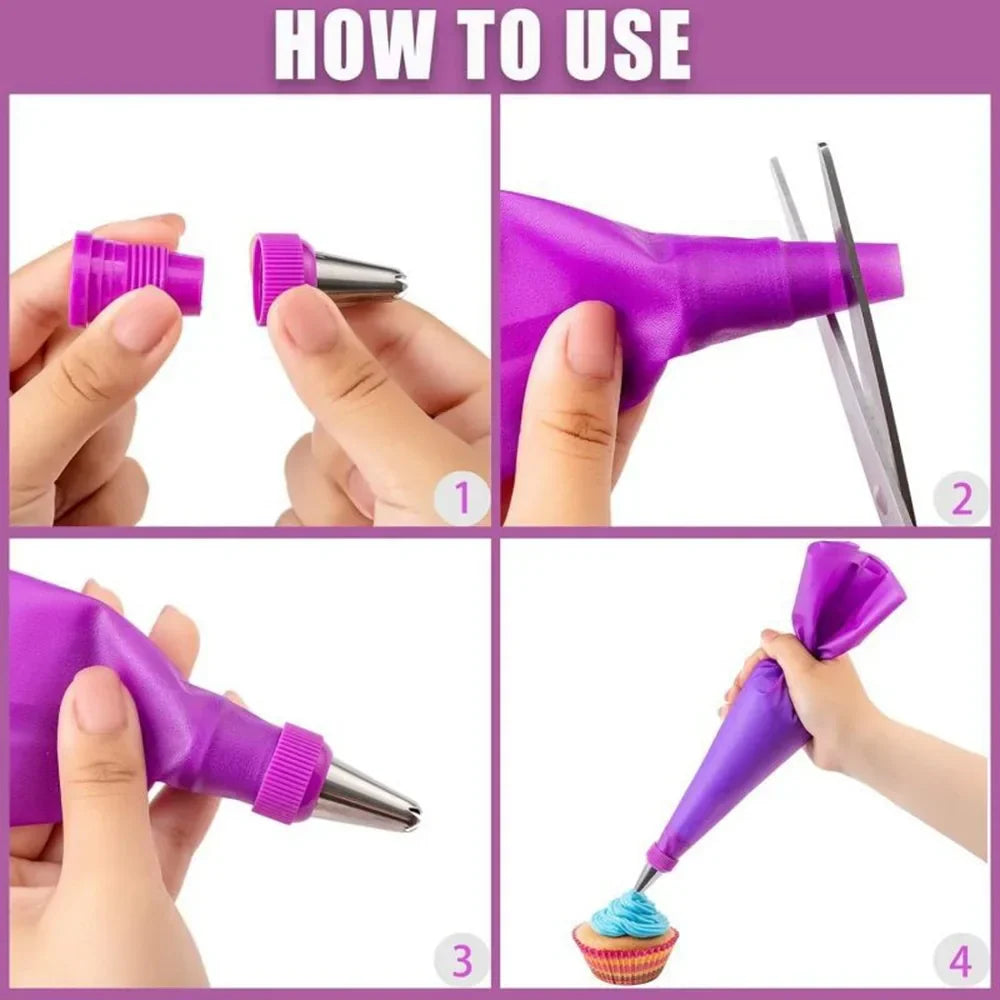 Alles, was du benötigst: 10 Spritztüllen aus rostfreiem Edelstahl, 1 wiederverwendbarer Silikonbeutel, 3 Teigschaber und vieles mehr – ideal für jedes Backabenteuer.