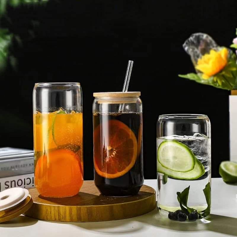 Transparenter runder Borosilikat-Glasbecher mit einem Deckel aus Bambus