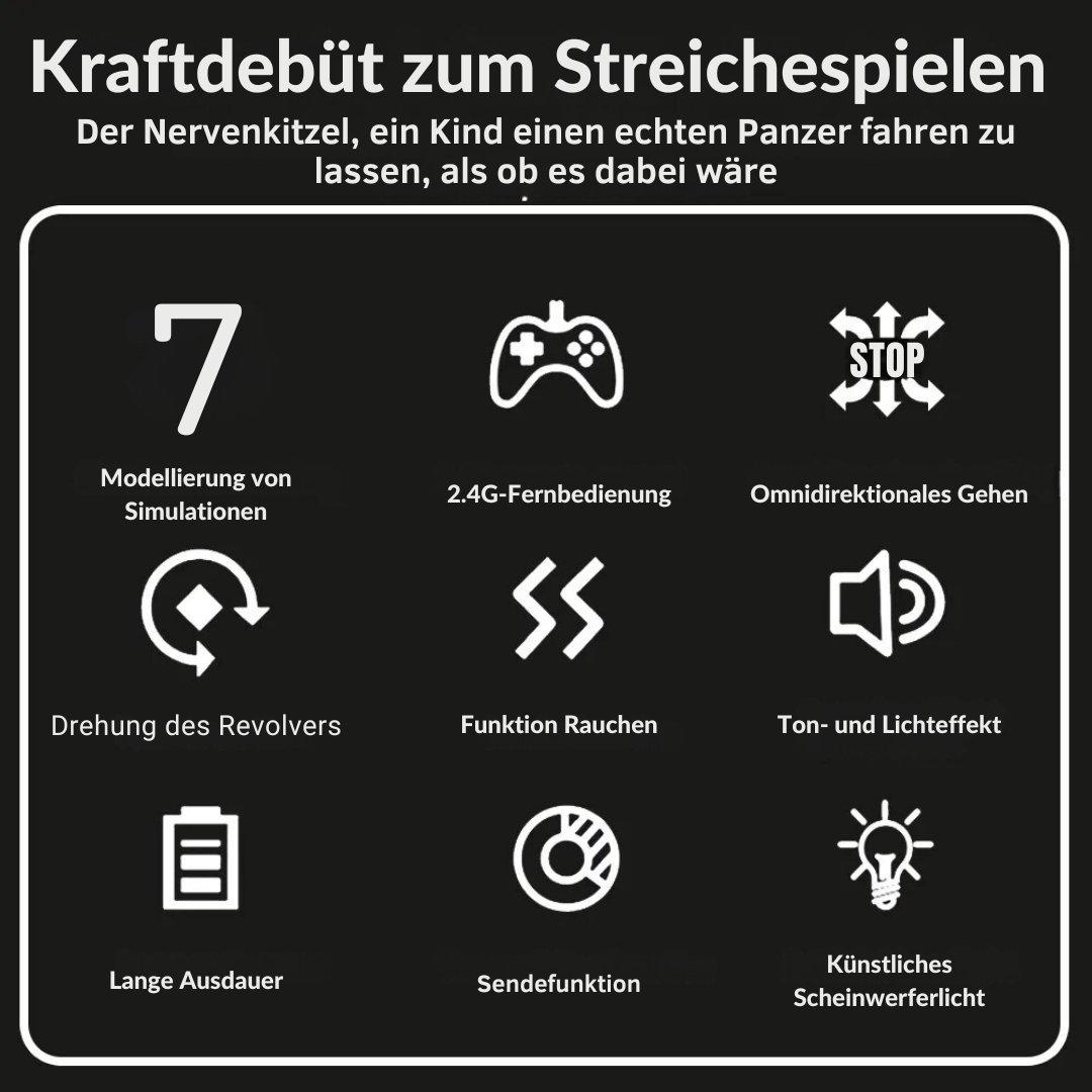Dieser ferngesteuerte Panzer ist ideal, um die Vorstellungskraft der Kinder anzuregen. Er fördert ihre strategischen Denkfähigkeiten, während sie stundenlang aufregende Action drinnen oder draußen erleben.