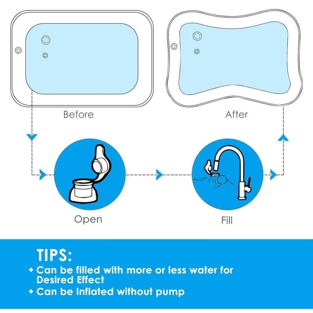 Hinweise zur Anwendung: Zuerst das große Ventil öffnen und die Matte mit Wasser aus dem Hahn befüllen. Danach das kleine Ventil öffnen und den äußeren Rahmen der Matte mit Luft befüllen. Wenn die Matte nicht mehr benötigt wird, kann das Wasser abgelassen und die Matte einfach zusammengefaltet werden.