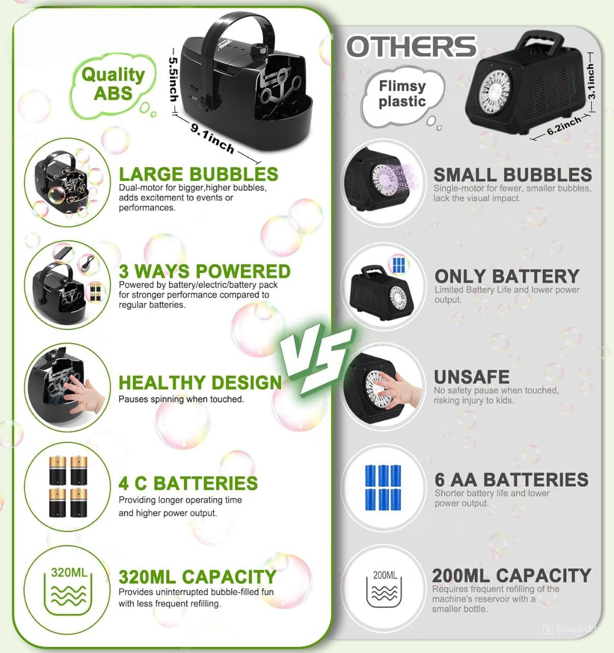 Unsere Seifenblasenmaschine produziert mehr als 18.000 bunte Seifenblasen pro Minute. Sie besteht aus robustem, rostfreiem ABS-Material und ist für alle Altersgruppen zertifiziert. Sie stoppt automatisch, wenn sie berührt wird. Darüber hinaus bietet der 320 ml Tank 30 Minuten ununterbrochenen Seifenblasen-Spaß.